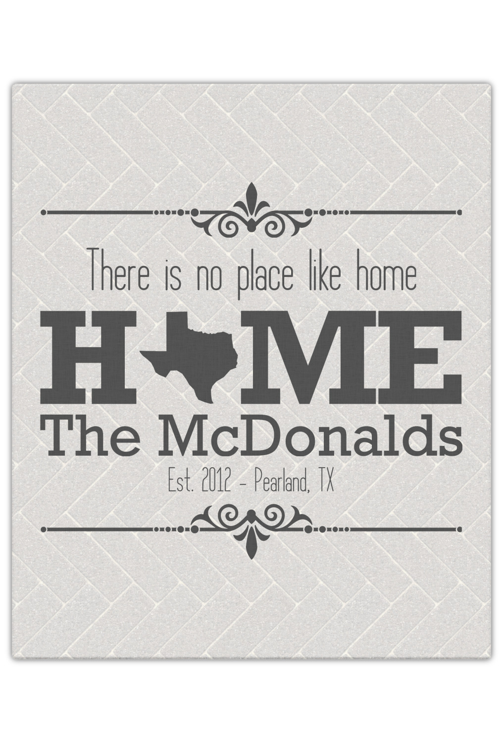 This design features a beatuiful graphic that spells out "Home" with your home state substituted for the "o". You are able to change the state to one of the 50 United States in our system. There is personalizable text above and below this with some ornate brackets on the top and bottom as well. The background is a subtle herringbone brick pattern that gives a nice homey touch. The color scheme is simply light and dark grey. This is the perfect design for home decor or a gift for a friend.