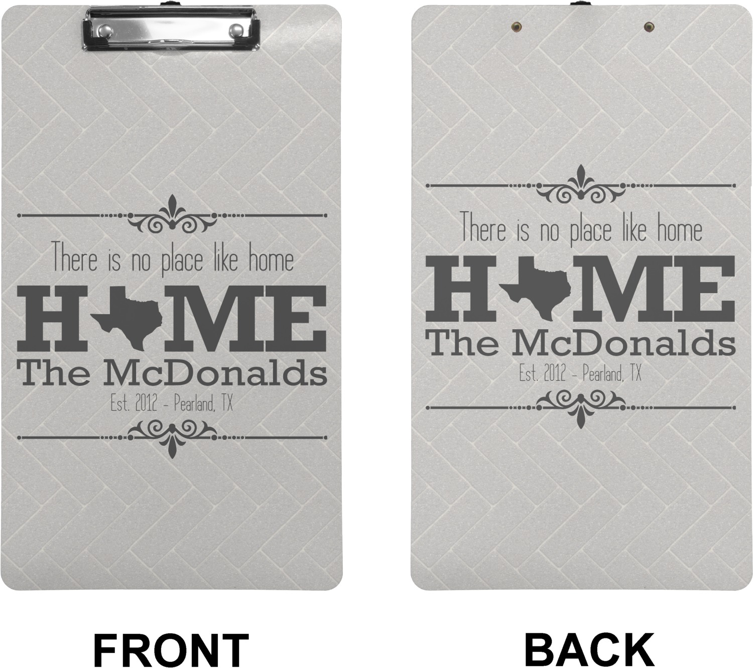 This design features a beatuiful graphic that spells out "Home" with your home state substituted for the "o". You are able to change the state to one of the 50 United States in our system. There is personalizable text above and below this with some ornate brackets on the top and bottom as well. The background is a subtle herringbone brick pattern that gives a nice homey touch. The color scheme is simply light and dark grey. This is the perfect design for home decor or a gift for a friend.