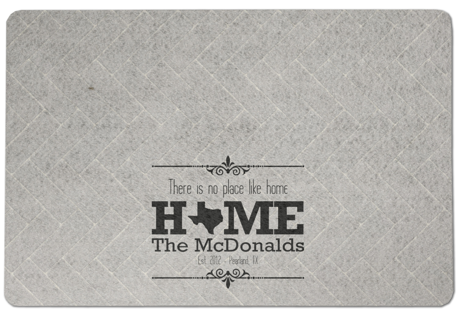 This design features a beatuiful graphic that spells out "Home" with your home state substituted for the "o". You are able to change the state to one of the 50 United States in our system. There is personalizable text above and below this with some ornate brackets on the top and bottom as well. The background is a subtle herringbone brick pattern that gives a nice homey touch. The color scheme is simply light and dark grey. This is the perfect design for home decor or a gift for a friend.