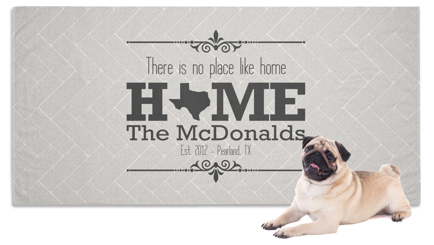 This design features a beatuiful graphic that spells out "Home" with your home state substituted for the "o". You are able to change the state to one of the 50 United States in our system. There is personalizable text above and below this with some ornate brackets on the top and bottom as well. The background is a subtle herringbone brick pattern that gives a nice homey touch. The color scheme is simply light and dark grey. This is the perfect design for home decor or a gift for a friend.