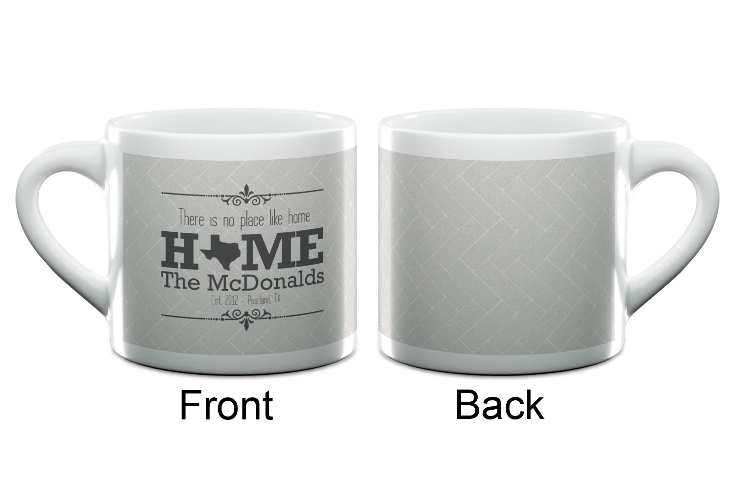 Each of our espresso mugs is a ceramic material sure to keep your drink warm. Personalize one cup for yourself, or order a set of 4! Its the perfect little gift for any coffee lover! We carry two sizes for you to personalize - 3 oz. (approx. 3.25" x 2.325" x 2.625") or 6 oz. (approx. 4" x 2.9" x 2.9"). Our 3 oz. mug is perfect for that single shot espresso while our 6 oz. mug can be your next favorite cappuccino cup holding two shots of espresso!