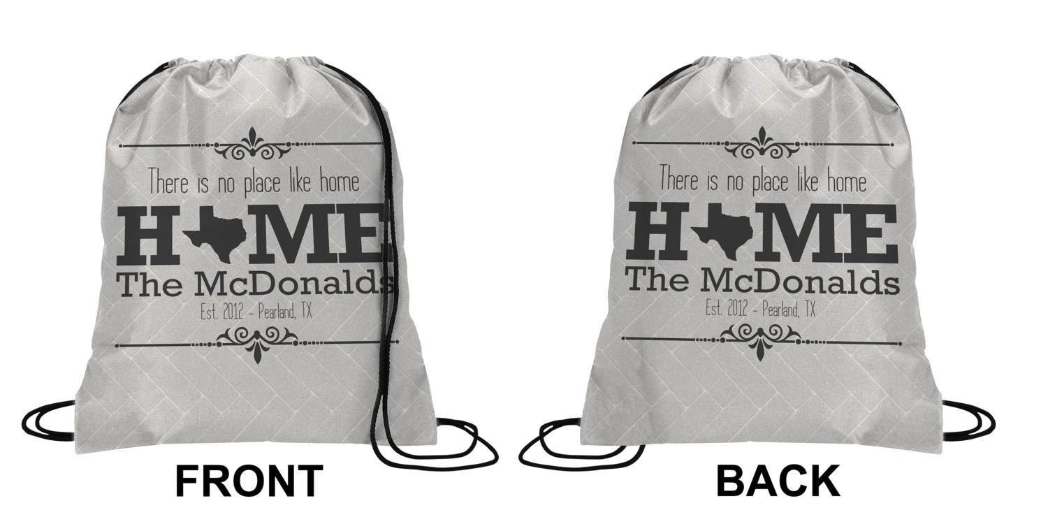 Your custom design will appear on the front and the back of the backpack. You can customize each side individually. The inside of the backpack is white and the drawstrings are black. The back pack is made of 100% polyester fabric.