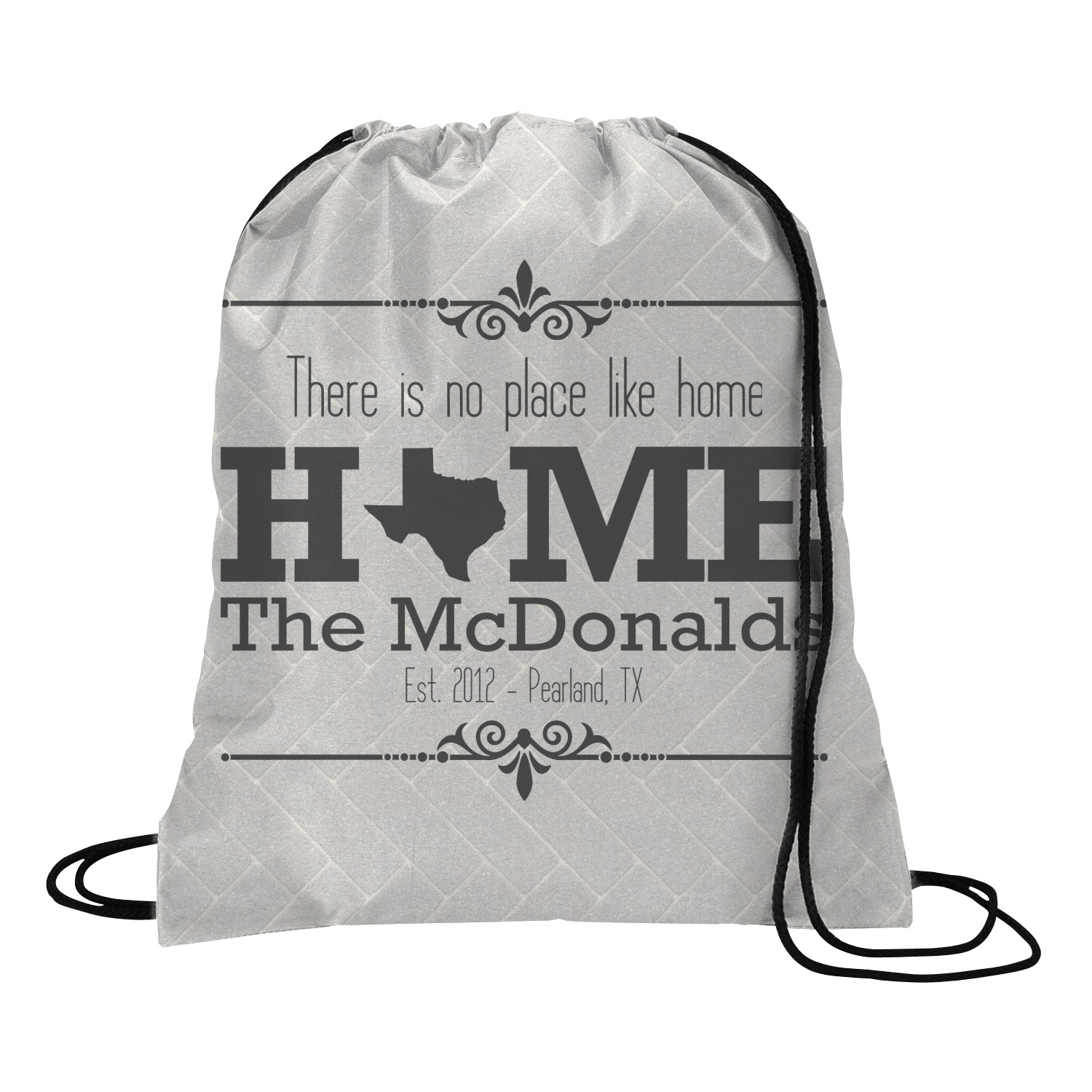 This design features a beatuiful graphic that spells out "Home" with your home state substituted for the "o". You are able to change the state to one of the 50 United States in our system. There is personalizable text above and below this with some ornate brackets on the top and bottom as well. The background is a subtle herringbone brick pattern that gives a nice homey touch. The color scheme is simply light and dark grey. This is the perfect design for home decor or a gift for a friend.
