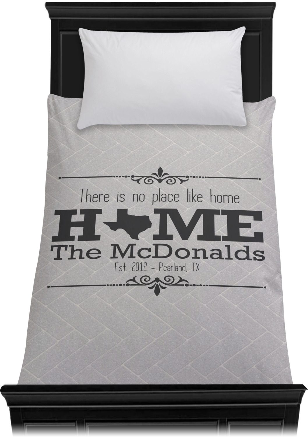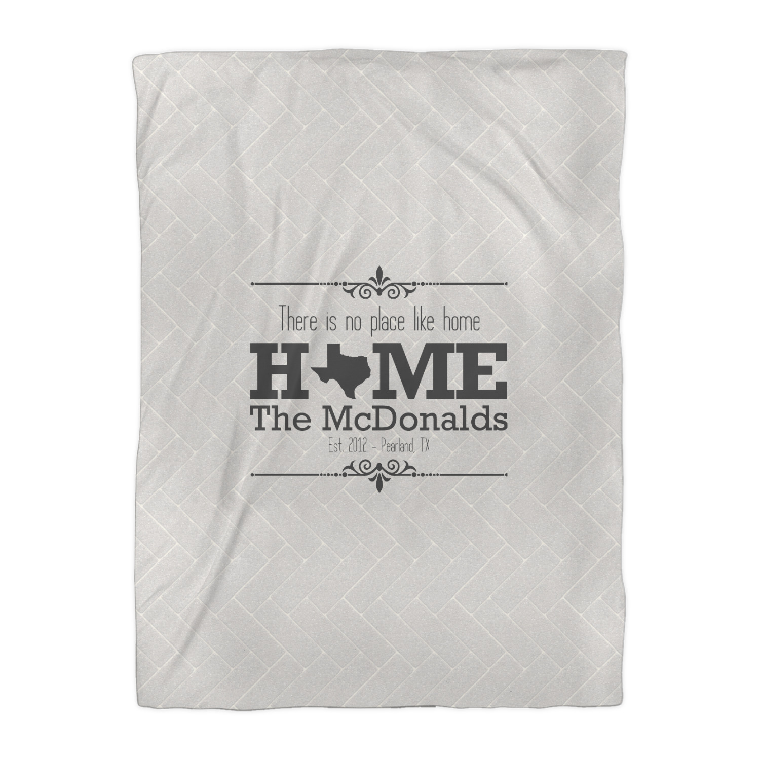 This design features a beatuiful graphic that spells out "Home" with your home state substituted for the "o". You are able to change the state to one of the 50 United States in our system. There is personalizable text above and below this with some ornate brackets on the top and bottom as well. The background is a subtle herringbone brick pattern that gives a nice homey touch. The color scheme is simply light and dark grey. This is the perfect design for home decor or a gift for a friend.