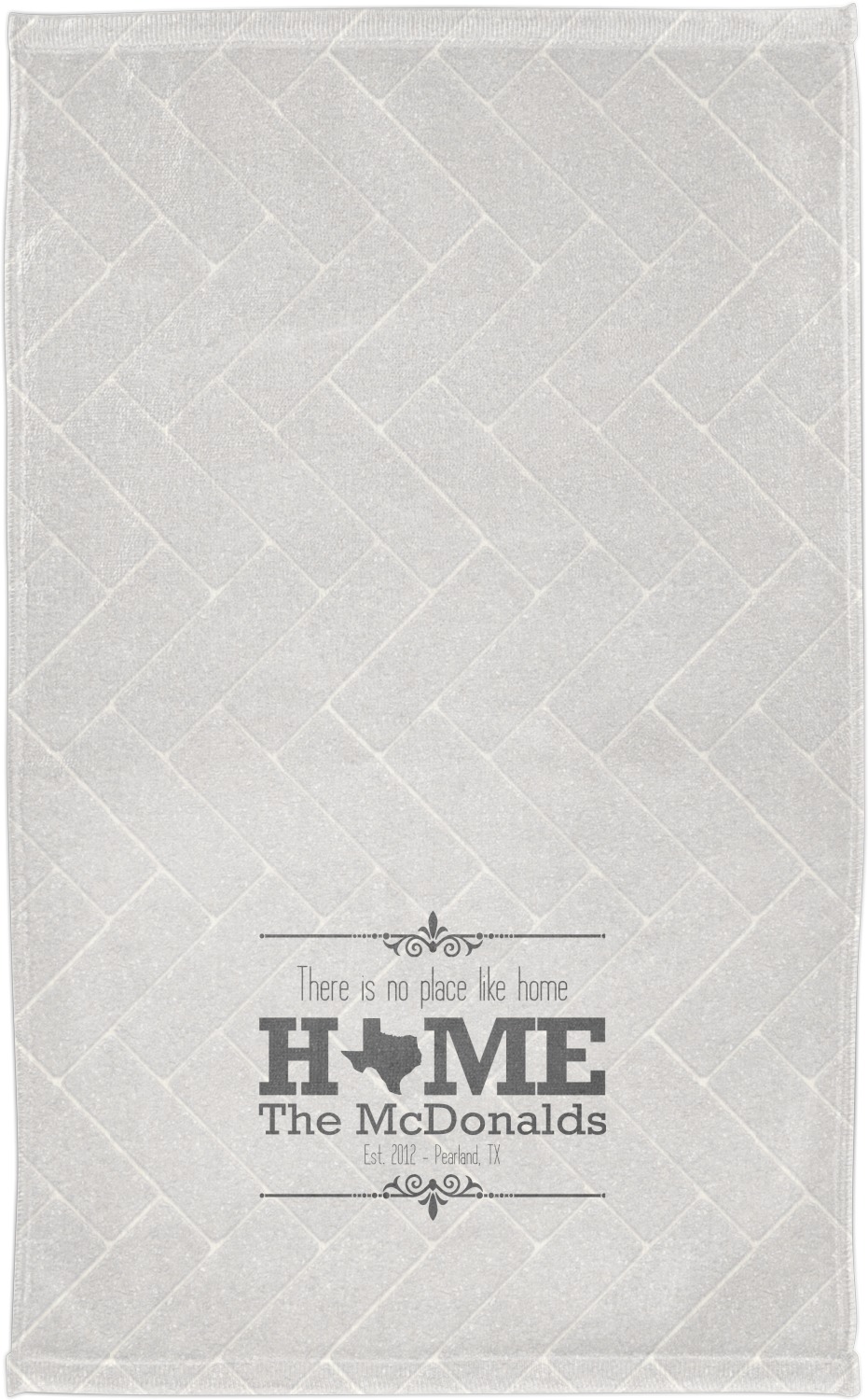 This design features a beatuiful graphic that spells out "Home" with your home state substituted for the "o". You are able to change the state to one of the 50 United States in our system. There is personalizable text above and below this with some ornate brackets on the top and bottom as well. The background is a subtle herringbone brick pattern that gives a nice homey touch. The color scheme is simply light and dark grey. This is the perfect design for home decor or a gift for a friend.