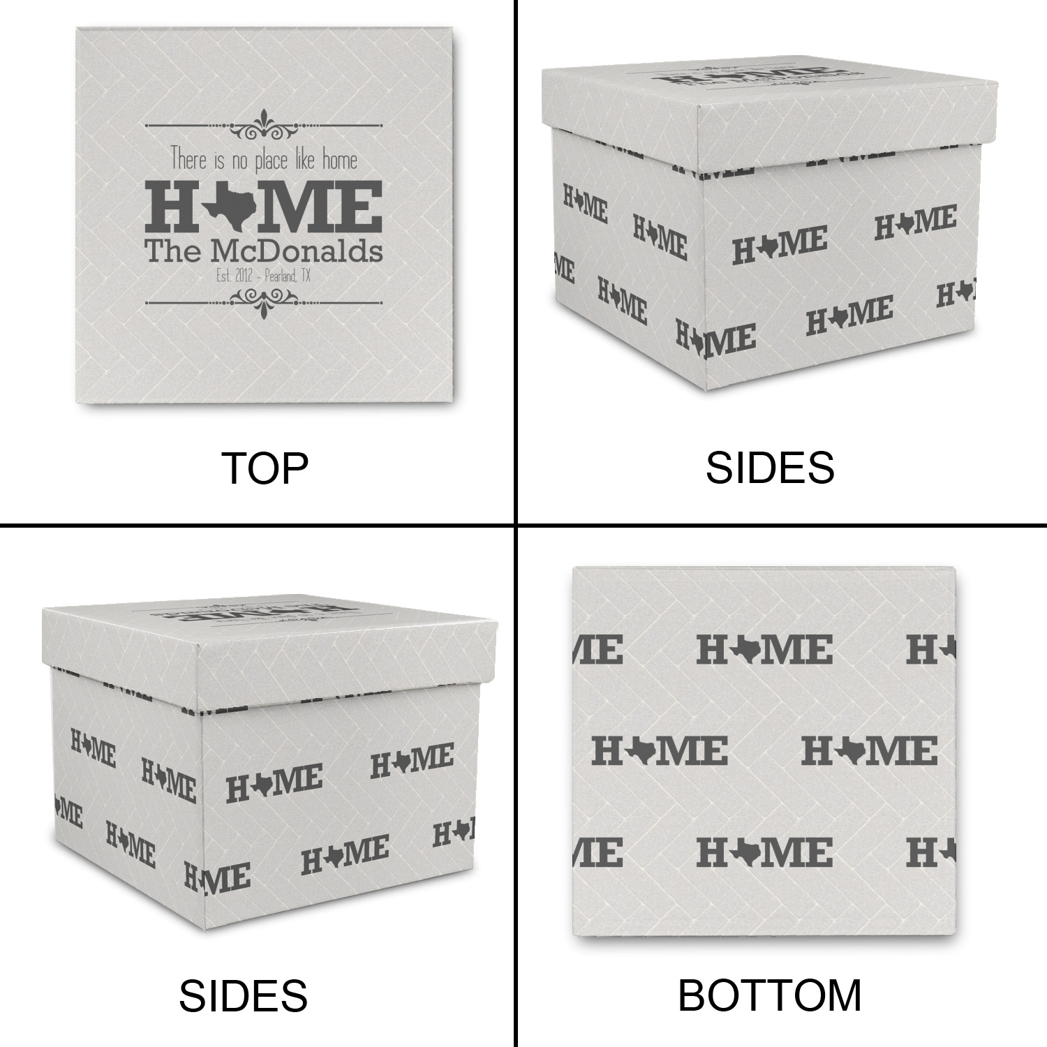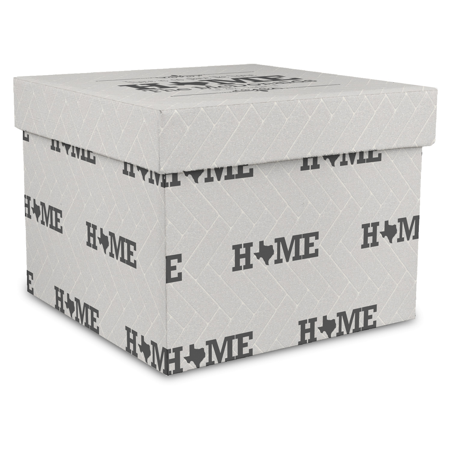 This design features a beatuiful graphic that spells out "Home" with your home state substituted for the "o". You are able to change the state to one of the 50 United States in our system. There is personalizable text above and below this with some ornate brackets on the top and bottom as well. The background is a subtle herringbone brick pattern that gives a nice homey touch. The color scheme is simply light and dark grey. This is the perfect design for home decor or a gift for a friend.