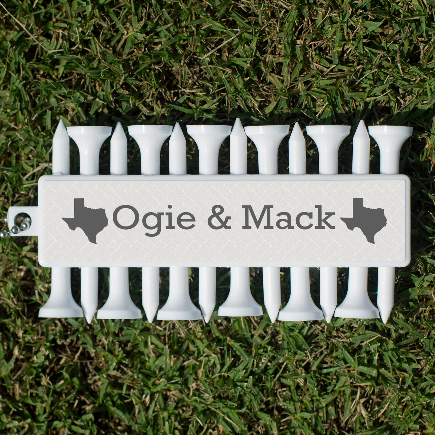 With 12 tees on a lightweight, portable key chain, it almost ensures a great 18 holes. Our tees are made of white plastic and are a little over 2". Design the front and the back of the golf tee holder. Pick from over a hundred designs, colors, and personalization styles! The set even comes with three removable ball markers as well!