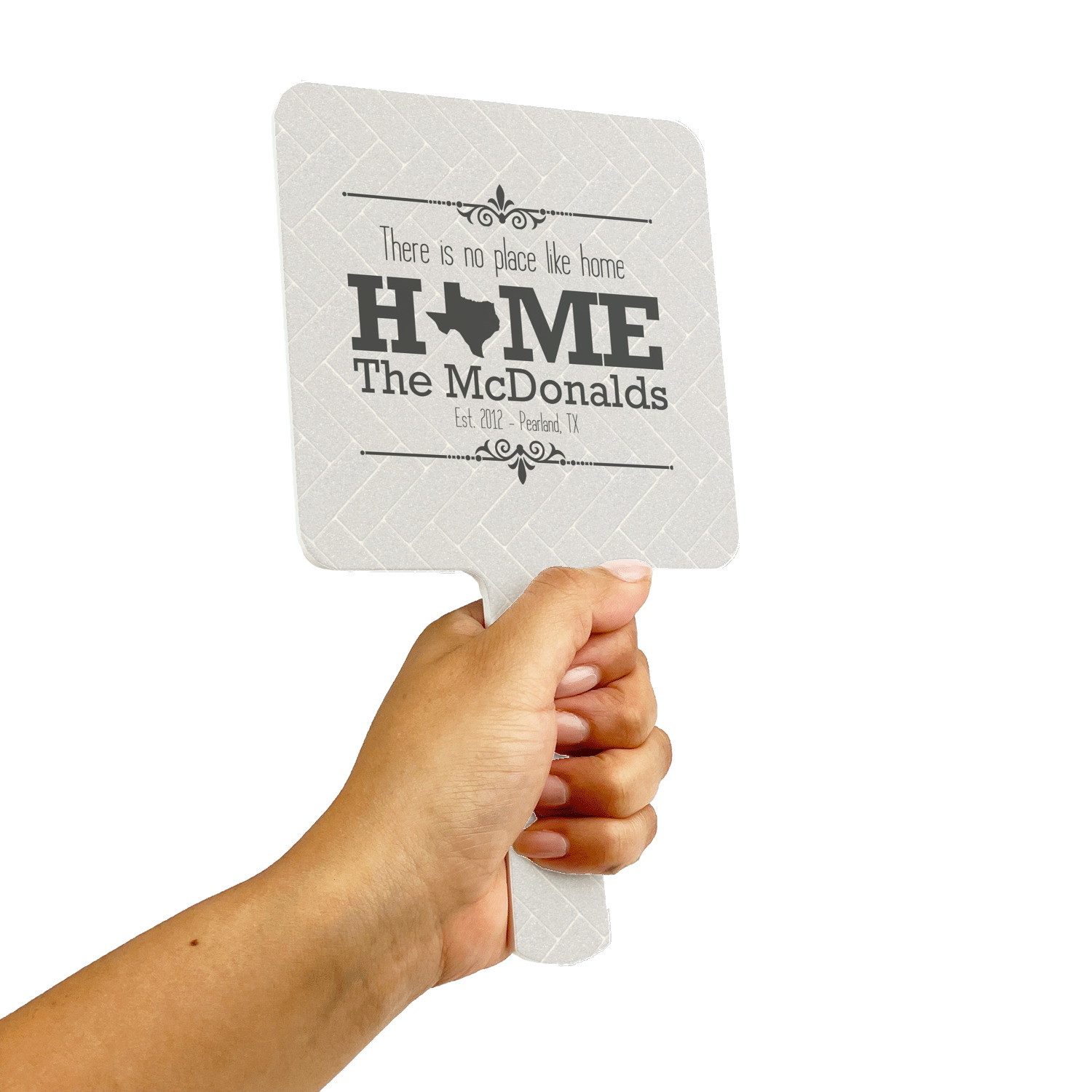 This design features a beatuiful graphic that spells out "Home" with your home state substituted for the "o". You are able to change the state to one of the 50 United States in our system. There is personalizable text above and below this with some ornate brackets on the top and bottom as well. The background is a subtle herringbone brick pattern that gives a nice homey touch. The color scheme is simply light and dark grey. This is the perfect design for home decor or a gift for a friend.