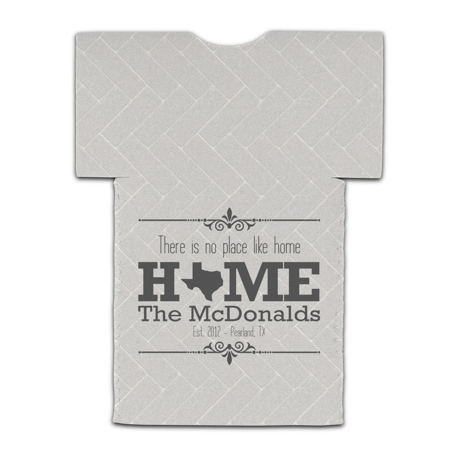 This design features a beatuiful graphic that spells out "Home" with your home state substituted for the "o". You are able to change the state to one of the 50 United States in our system. There is personalizable text above and below this with some ornate brackets on the top and bottom as well. The background is a subtle herringbone brick pattern that gives a nice homey touch. The color scheme is simply light and dark grey. This is the perfect design for home decor or a gift for a friend.