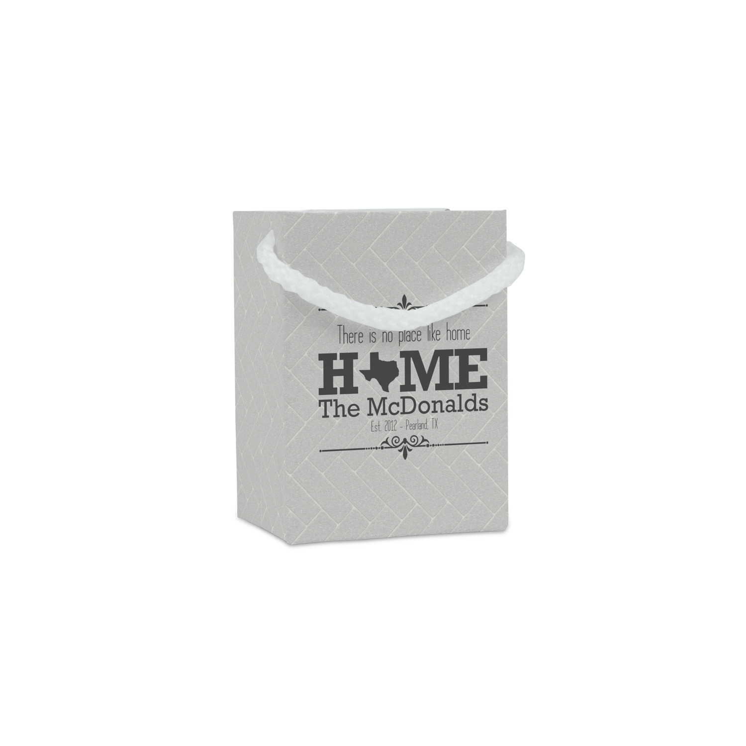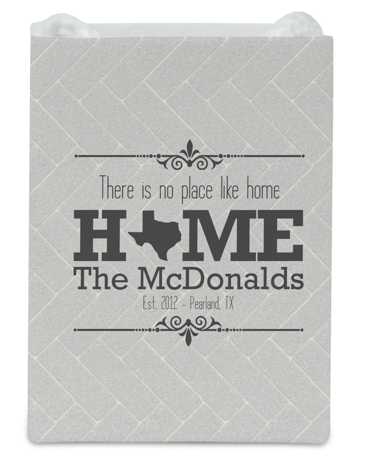 This design features a beatuiful graphic that spells out "Home" with your home state substituted for the "o". You are able to change the state to one of the 50 United States in our system. There is personalizable text above and below this with some ornate brackets on the top and bottom as well. The background is a subtle herringbone brick pattern that gives a nice homey touch. The color scheme is simply light and dark grey. This is the perfect design for home decor or a gift for a friend.