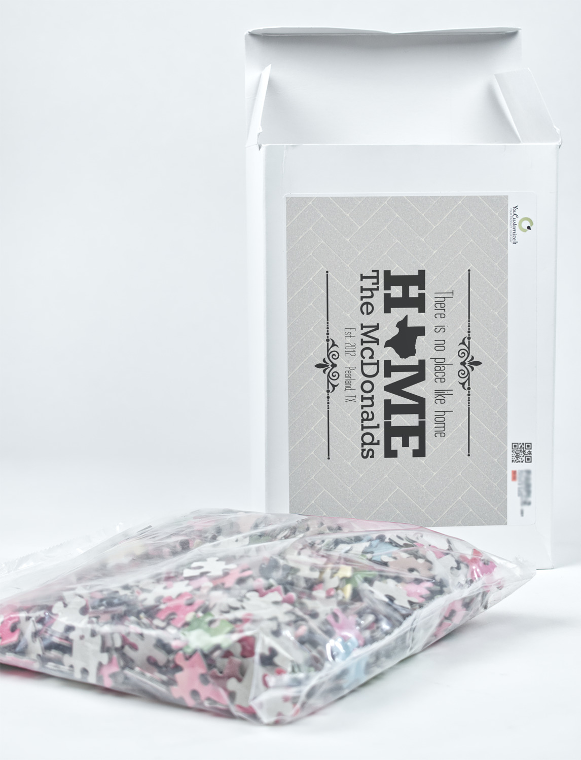 We print our puzzles on thick white chipboard in vibrant colors, then laminate the chipboard and die cut your puzzle. Your jigsaw puzzle is shipped to you in a box with the image of the puzzle on the box.