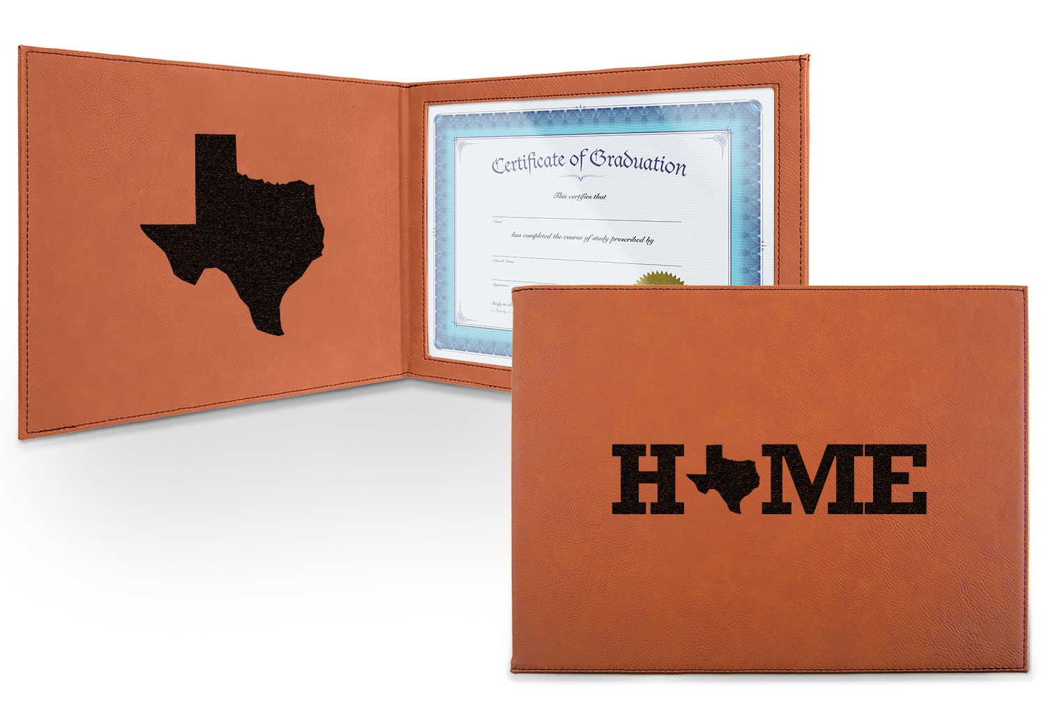 This cognac-colored, leatherette certificate jacket is the ideal way to display or store your hard-earned certificate. When closed, the custom certificate holder measures at 12 by 9 inches. The interior of the certificate cover includes a clear, vinyl window to encase your diploma. The window measures at around 10.5 by 7.5 inches and can accommodate a diploma that measures at up to 8.5 by 11 inches. You can either choose to have your customization laser engraved on the front and interior, or solely the front.