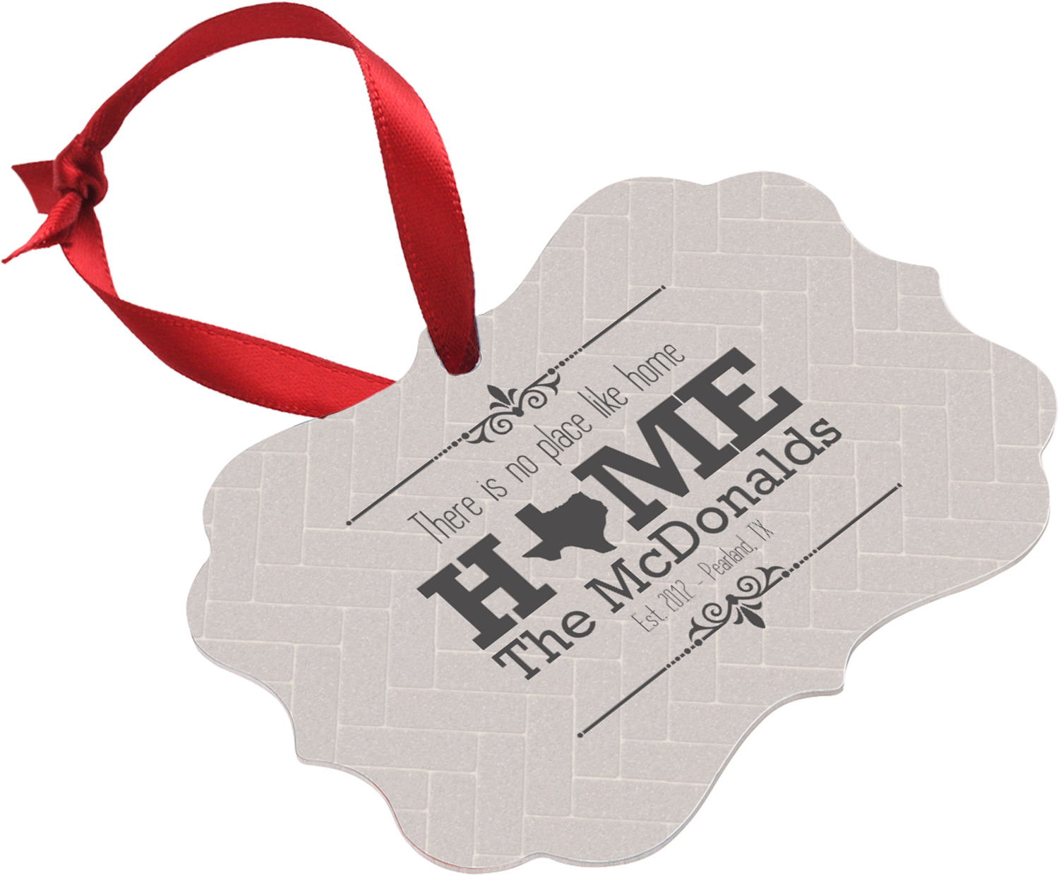 This design features a beatuiful graphic that spells out "Home" with your home state substituted for the "o". You are able to change the state to one of the 50 United States in our system. There is personalizable text above and below this with some ornate brackets on the top and bottom as well. The background is a subtle herringbone brick pattern that gives a nice homey touch. The color scheme is simply light and dark grey. This is the perfect design for home decor or a gift for a friend.