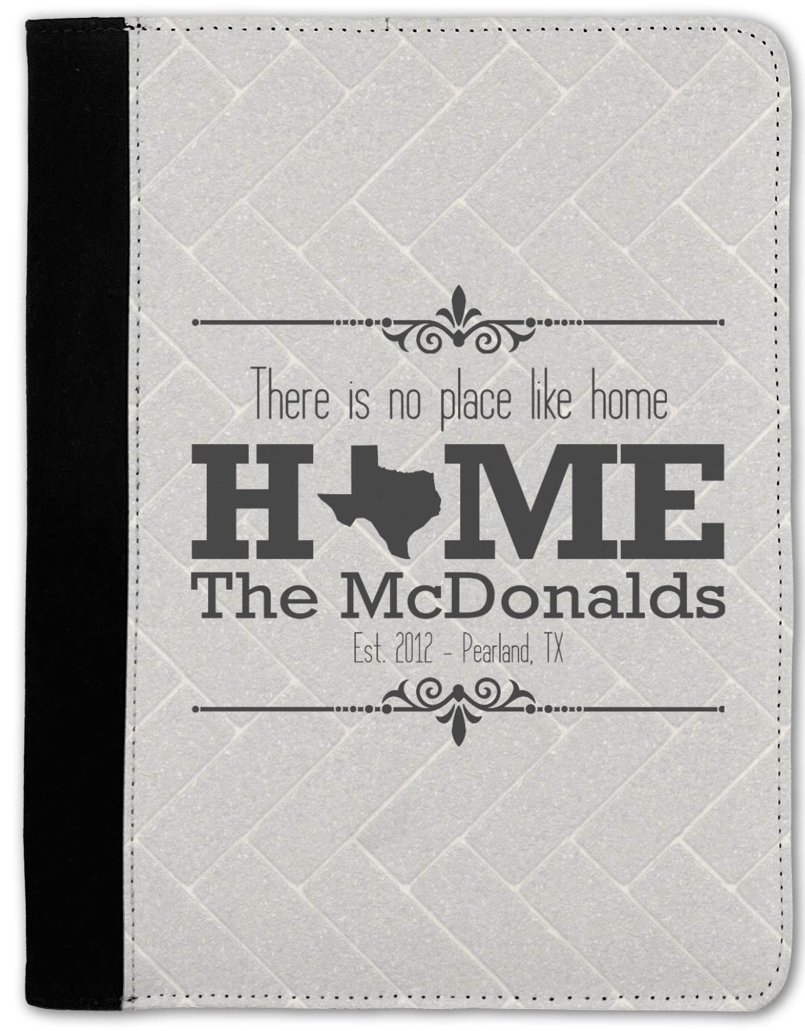 This design features a beatuiful graphic that spells out "Home" with your home state substituted for the "o". You are able to change the state to one of the 50 United States in our system. There is personalizable text above and below this with some ornate brackets on the top and bottom as well. The background is a subtle herringbone brick pattern that gives a nice homey touch. The color scheme is simply light and dark grey. This is the perfect design for home decor or a gift for a friend.