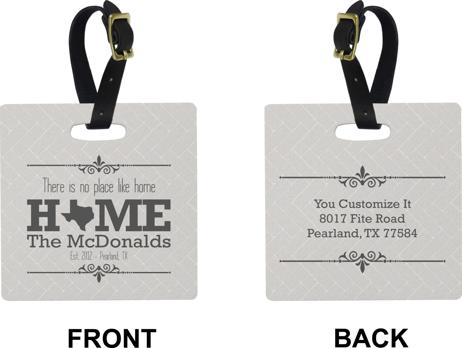 These personalized bag tags are sold in a variety of shapes, so that you may find the product that meets your vision exactly. We sell a round luggage tag, which measures at approximately 4" x 4". Our square luggage tag is about 3.5" x 3.5", while our rectangular version is 2.75" x 4 ".