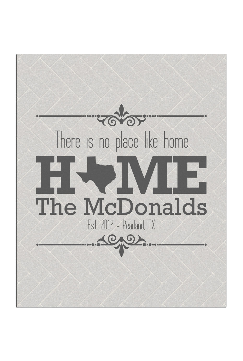 This design features a beatuiful graphic that spells out "Home" with your home state substituted for the "o". You are able to change the state to one of the 50 United States in our system. There is personalizable text above and below this with some ornate brackets on the top and bottom as well. The background is a subtle herringbone brick pattern that gives a nice homey touch. The color scheme is simply light and dark grey. This is the perfect design for home decor or a gift for a friend.