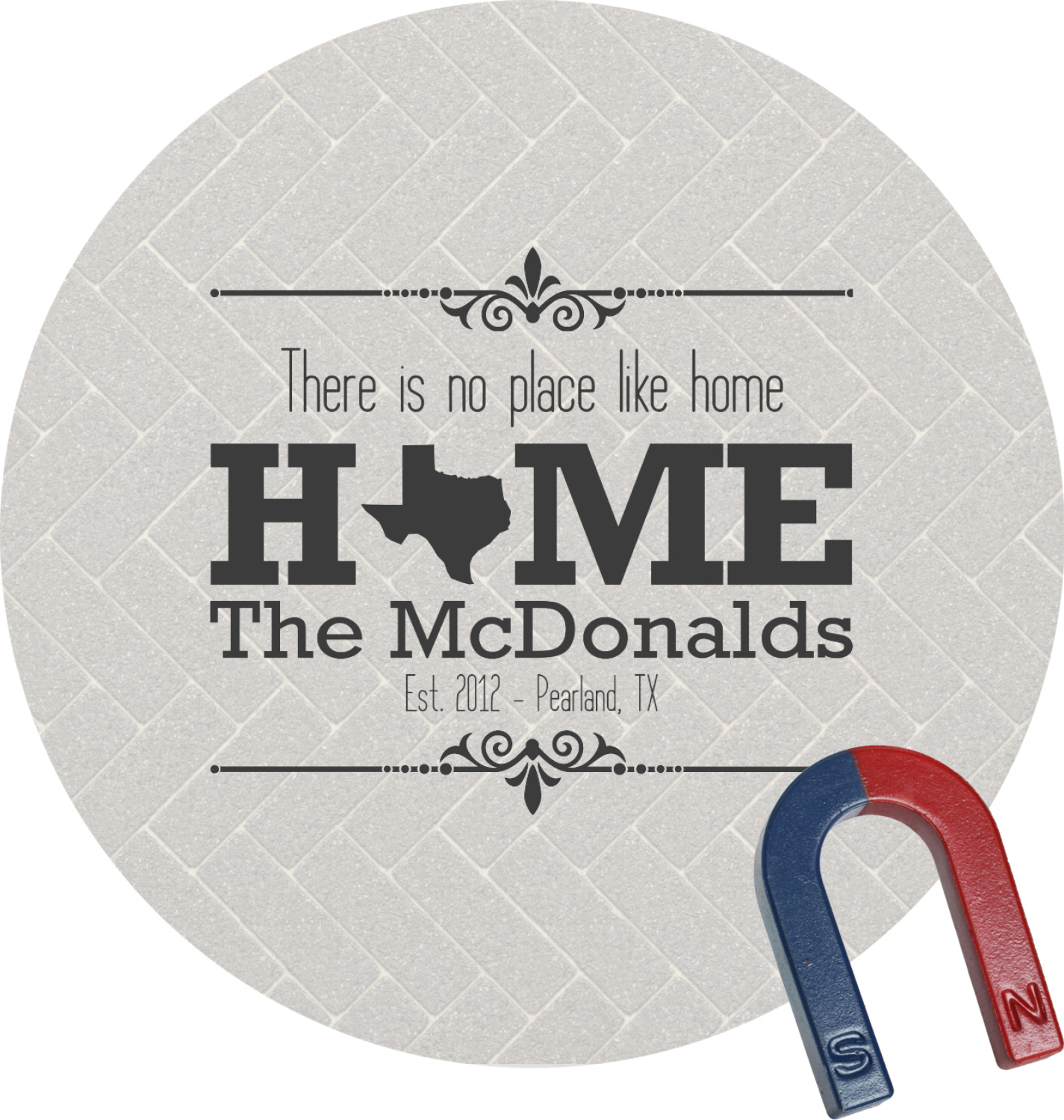 This design features a beatuiful graphic that spells out "Home" with your home state substituted for the "o". You are able to change the state to one of the 50 United States in our system. There is personalizable text above and below this with some ornate brackets on the top and bottom as well. The background is a subtle herringbone brick pattern that gives a nice homey touch. The color scheme is simply light and dark grey. This is the perfect design for home decor or a gift for a friend.