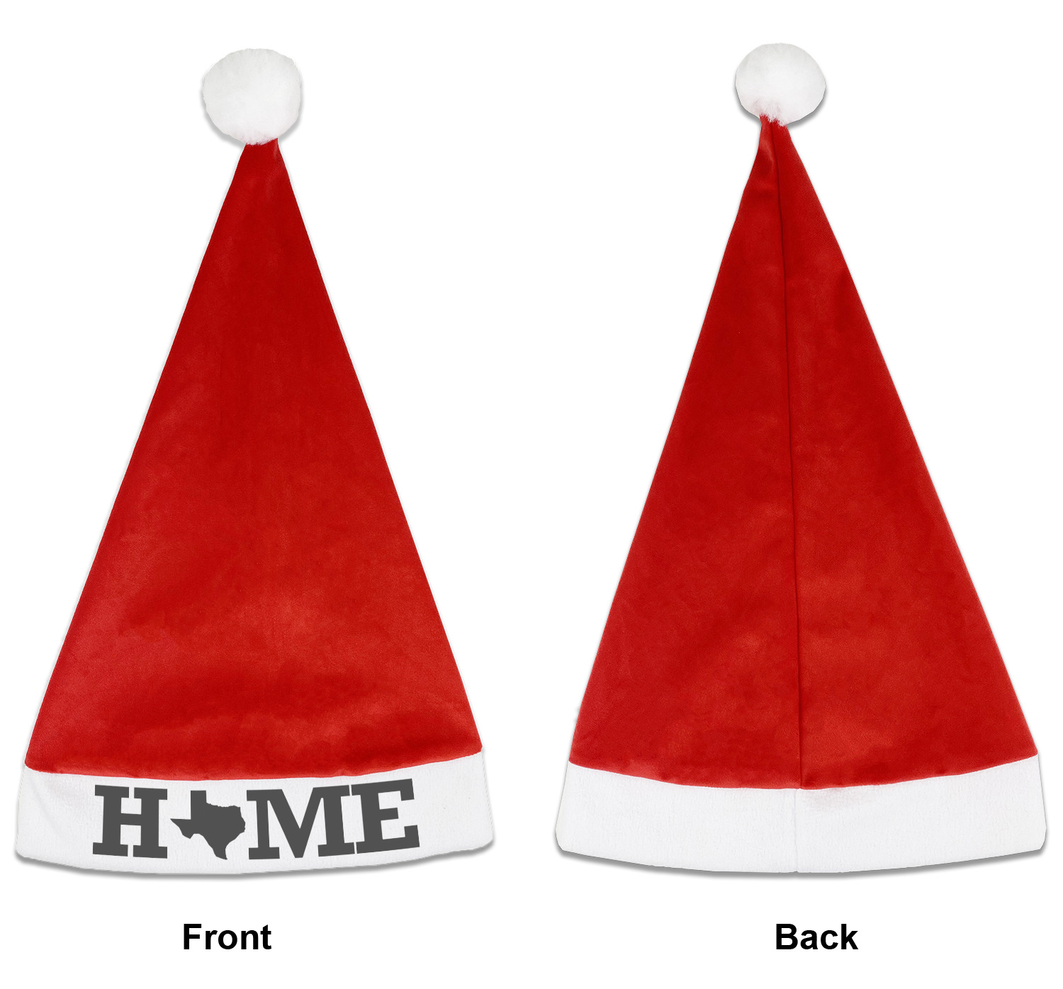 Our Santa hats are a soft, velvety polyester material. These customizable Santa hats are a classic red with white brimming and pom pom ball hanging off the hat tail just like Santa Claus! Each personalized Santa hat is approximately 17.5 L x 11.8 W. We offer two different styles to print your designs on the white brim - front or front & back.