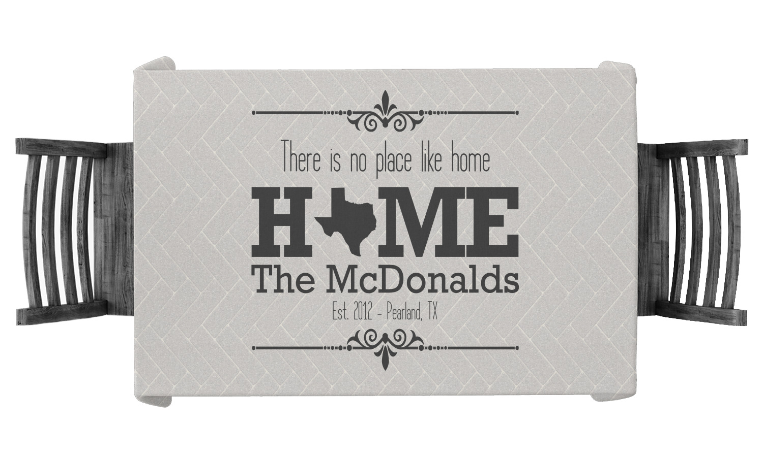 This design features a beatuiful graphic that spells out "Home" with your home state substituted for the "o". You are able to change the state to one of the 50 United States in our system. There is personalizable text above and below this with some ornate brackets on the top and bottom as well. The background is a subtle herringbone brick pattern that gives a nice homey touch. The color scheme is simply light and dark grey. This is the perfect design for home decor or a gift for a friend.