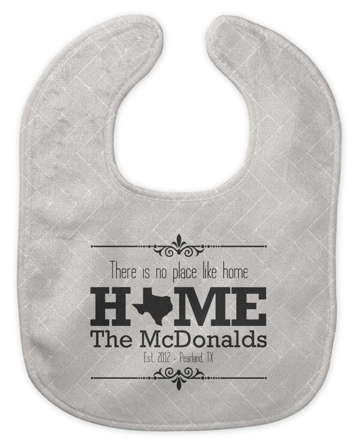 Made of soft polyester, each customizable bib hugs comfortably around the neck to catch every drip and drool. Each bib design is printed with baby-safe ink and finished with a secure stitch pattern and velcro clasp. We carry two customizable bib styles -Microfiber Velour and Jersey Knit.