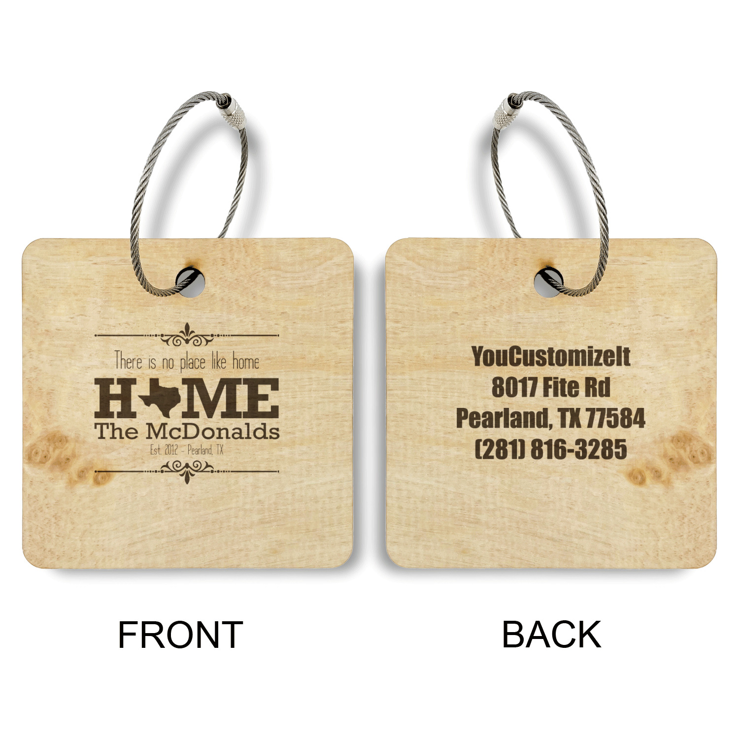 Made from a premium hardwood, these luggage tags are laser engraved and cut just for you. The front contains your design of choice and the back has your contact information to ensure your luggage gets back to you if ever lost.