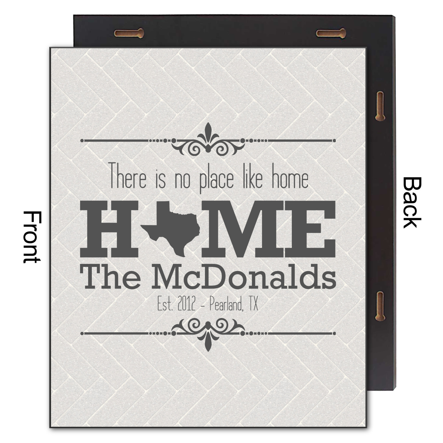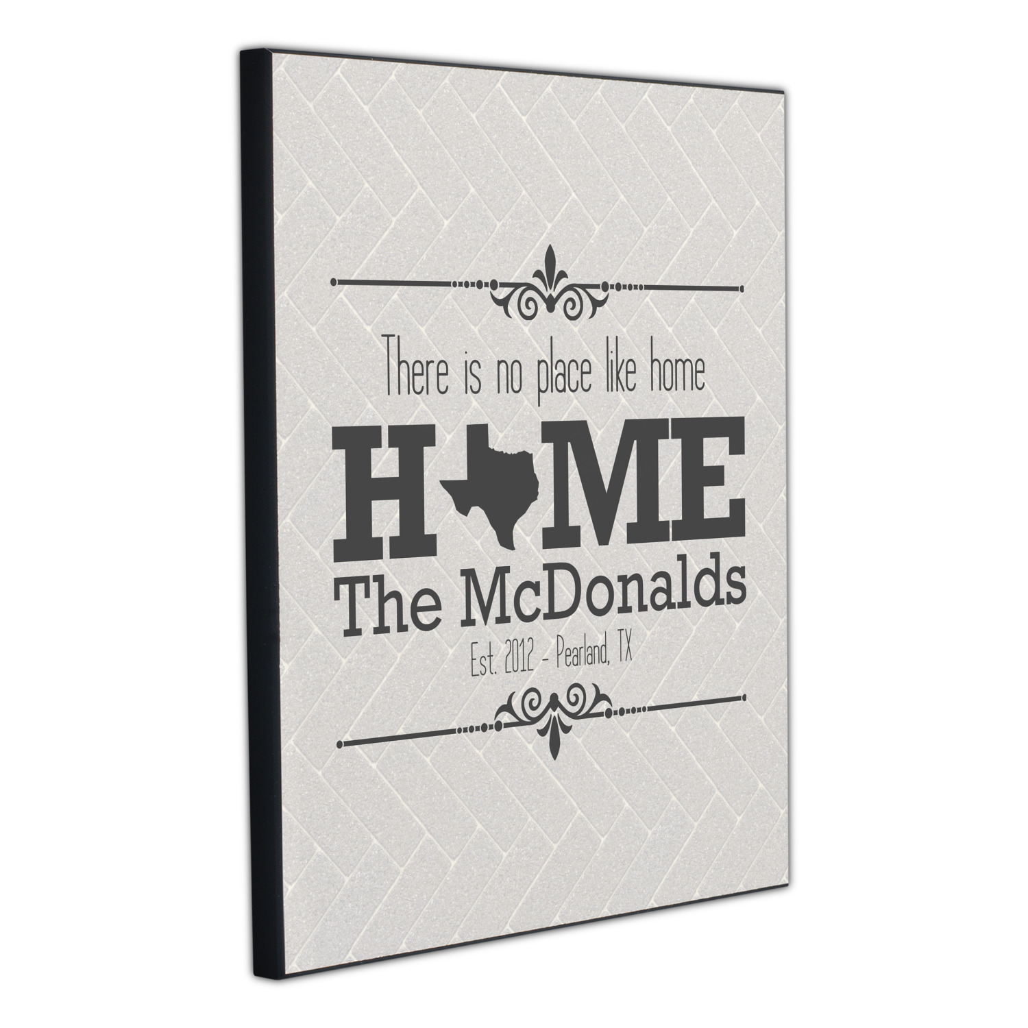 This design features a beatuiful graphic that spells out "Home" with your home state substituted for the "o". You are able to change the state to one of the 50 United States in our system. There is personalizable text above and below this with some ornate brackets on the top and bottom as well. The background is a subtle herringbone brick pattern that gives a nice homey touch. The color scheme is simply light and dark grey. This is the perfect design for home decor or a gift for a friend.