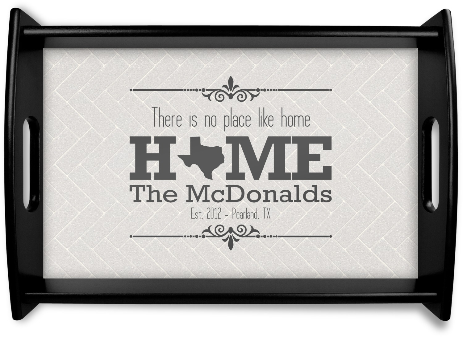 This serving tray with handles features square edges and two rounded sides, creating a very modern look. Each side is fabricated from a beautifully cut, natural wood. The bottom of the interior of the tray displays your customized design in bright, vibrant color. The tray is sold in both a black color and a natural wood look. Each variation of the wood serving tray has two sizes: Small, which is 14" x 10" x 2.25", and Large, which is 19.5" x 13.5" x 2.75".