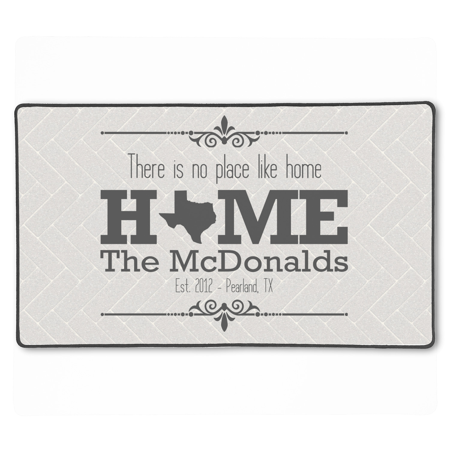This design features a beatuiful graphic that spells out "Home" with your home state substituted for the "o". You are able to change the state to one of the 50 United States in our system. There is personalizable text above and below this with some ornate brackets on the top and bottom as well. The background is a subtle herringbone brick pattern that gives a nice homey touch. The color scheme is simply light and dark grey. This is the perfect design for home decor or a gift for a friend.