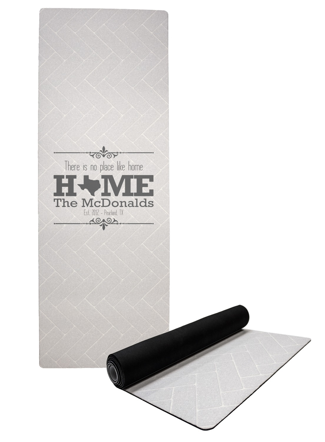 The top of the mats are dyed with your design using eco friendly non solvent inks. They have a smooth fleece felt top and feels very soft. The back of the mat is a sleek black and is a squishy non-slip texture to ensure that your mat does not slip on the floor. Our rubber backed mats are the perfect size at 68" x 24" and are just under approximately 1/4 inch thickness.