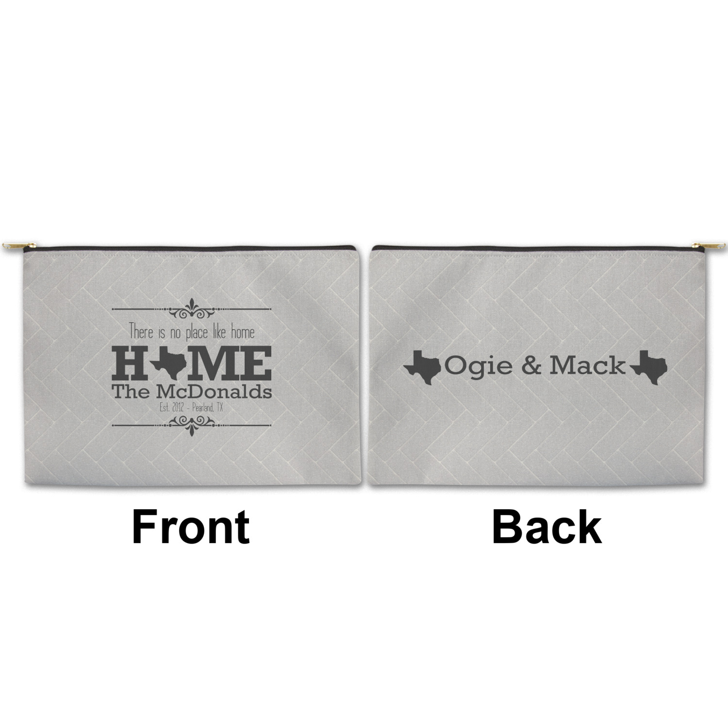 You can design both the front and the back of the pouch - same design, two complementary designs or two totally different designs - the choice is yours! We offer many different personalization styles i.e. name, name & initial, monograms - so the choice to personalize is also yours.