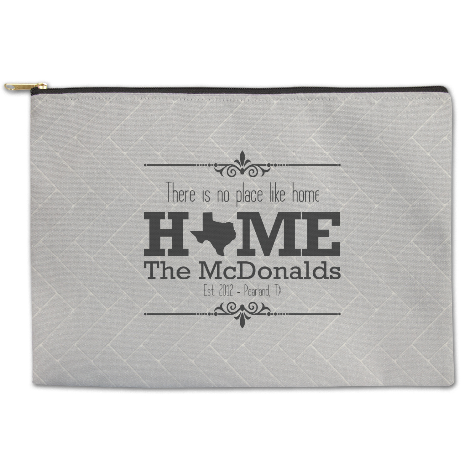 This design features a beatuiful graphic that spells out "Home" with your home state substituted for the "o". You are able to change the state to one of the 50 United States in our system. There is personalizable text above and below this with some ornate brackets on the top and bottom as well. The background is a subtle herringbone brick pattern that gives a nice homey touch. The color scheme is simply light and dark grey. This is the perfect design for home decor or a gift for a friend.