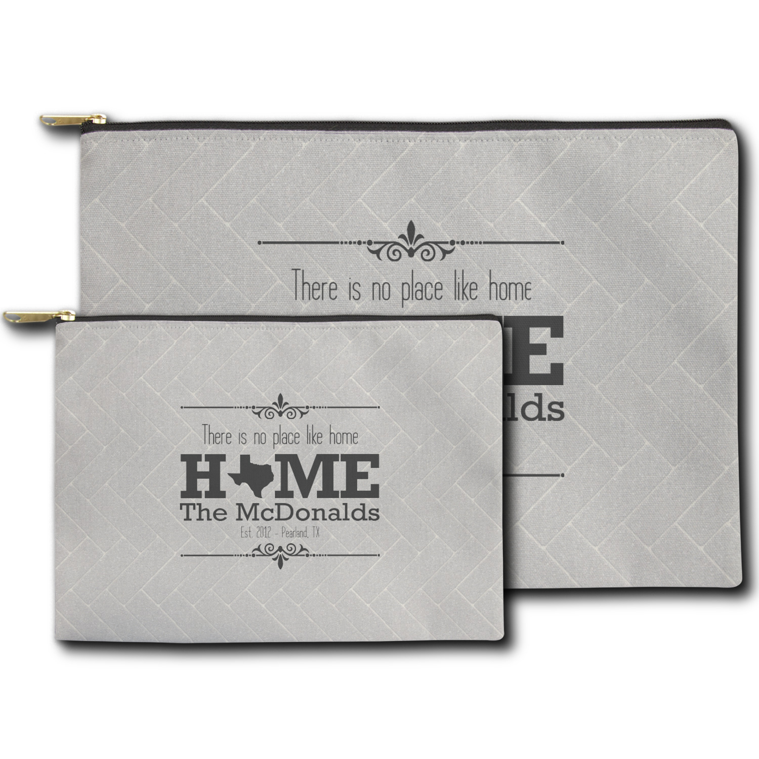 Our zippered pouches are available in two sizes - small: approx 8.5W"x6H and large: approx 12.5Wx8.5H. The pouches are made from a soft & durable canvas fabric that is printed on the outside with your design; the inside has a fused black lining. The printed canvas fabric is then cut and the pouches are sewn right here in the USA. The zipper itself is gold in color and has a round hook.