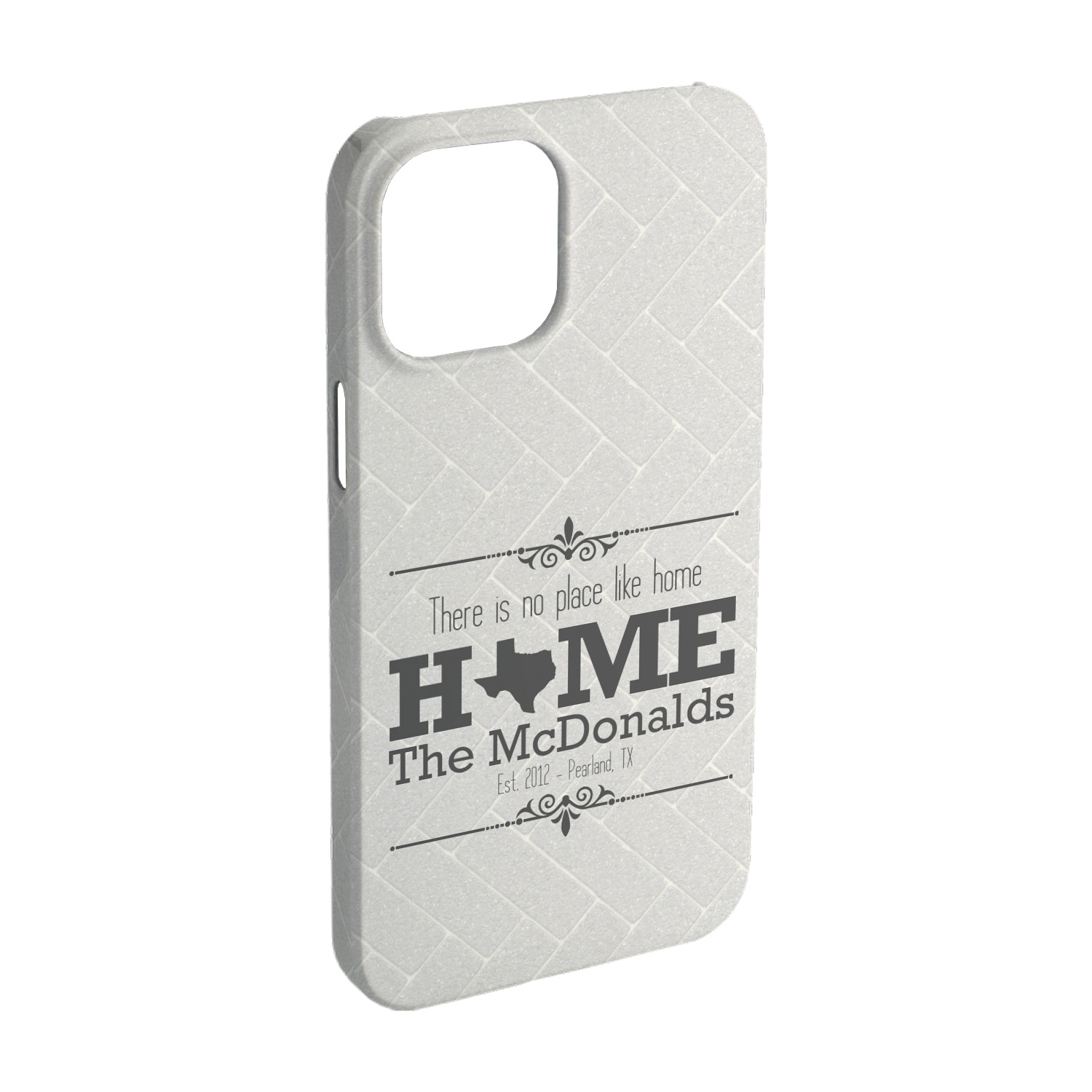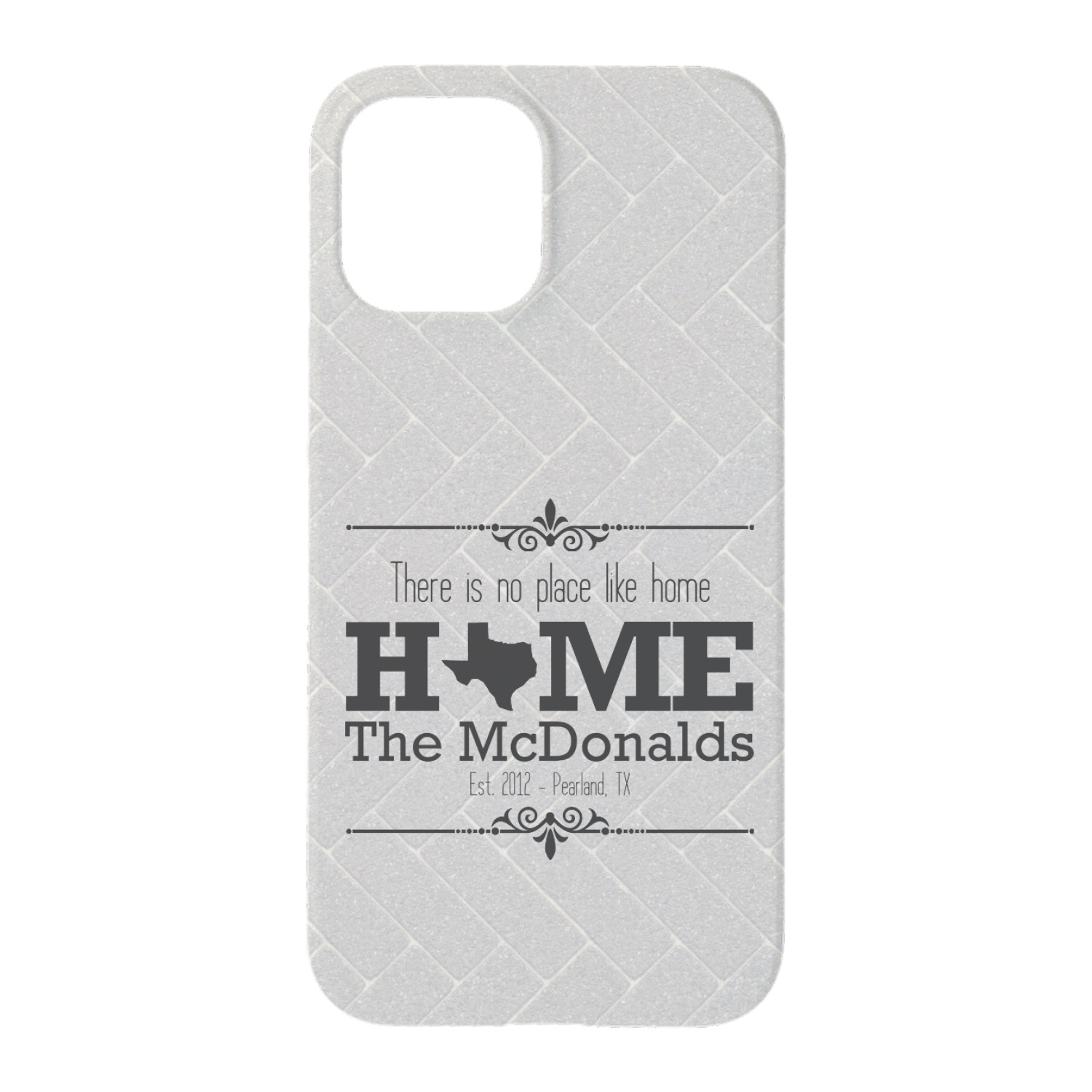 This design features a beatuiful graphic that spells out "Home" with your home state substituted for the "o". You are able to change the state to one of the 50 United States in our system. There is personalizable text above and below this with some ornate brackets on the top and bottom as well. The background is a subtle herringbone brick pattern that gives a nice homey touch. The color scheme is simply light and dark grey. This is the perfect design for home decor or a gift for a friend.