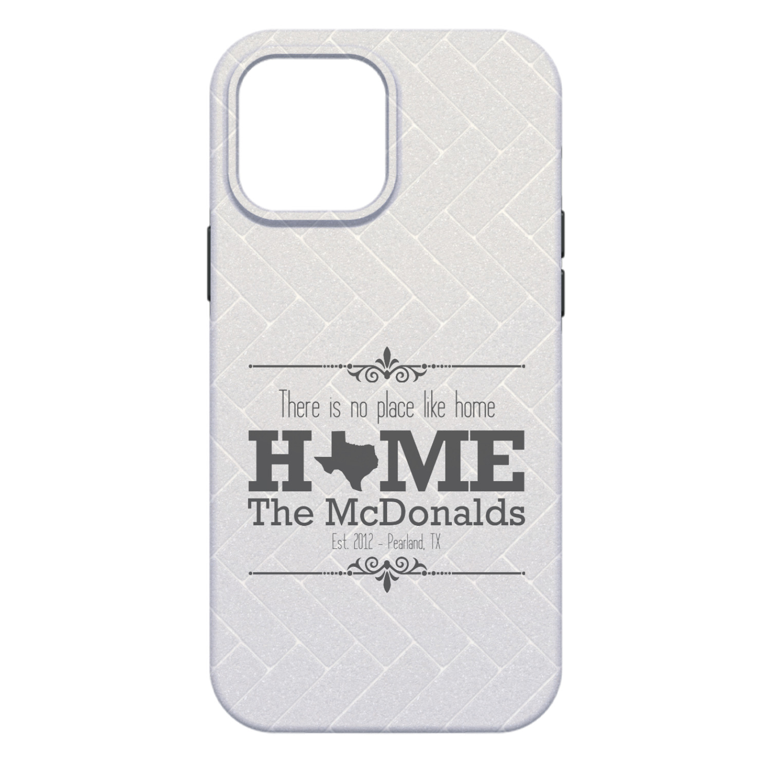 This design features a beatuiful graphic that spells out "Home" with your home state substituted for the "o". You are able to change the state to one of the 50 United States in our system. There is personalizable text above and below this with some ornate brackets on the top and bottom as well. The background is a subtle herringbone brick pattern that gives a nice homey touch. The color scheme is simply light and dark grey. This is the perfect design for home decor or a gift for a friend.