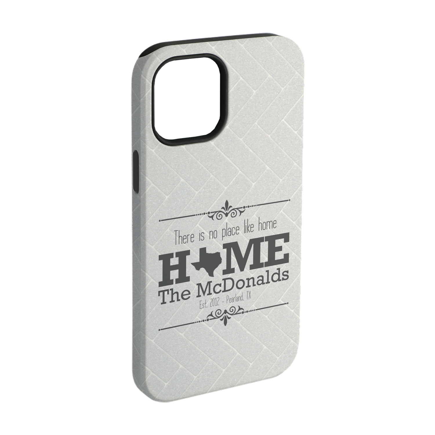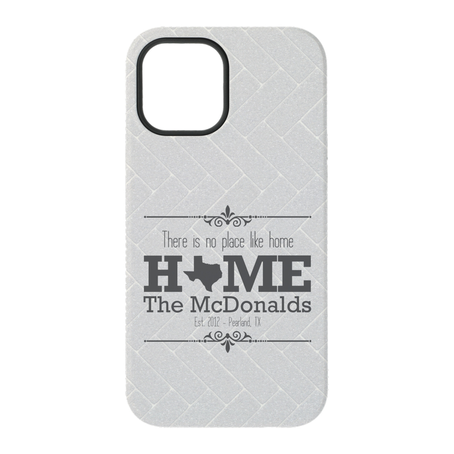 This design features a beatuiful graphic that spells out "Home" with your home state substituted for the "o". You are able to change the state to one of the 50 United States in our system. There is personalizable text above and below this with some ornate brackets on the top and bottom as well. The background is a subtle herringbone brick pattern that gives a nice homey touch. The color scheme is simply light and dark grey. This is the perfect design for home decor or a gift for a friend.
