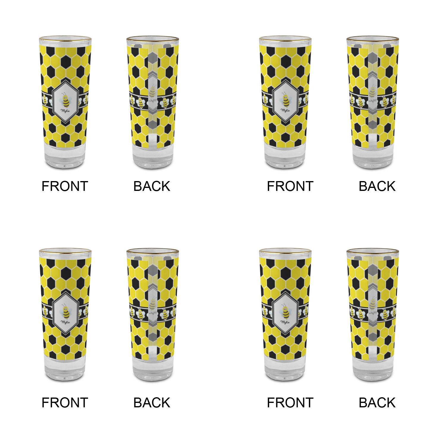 These glass shooter glasses are printed in full color with the design of your choice. These are a tall shooter 2 oz size and stand 4" tall. The print is a full wrap design to boldly display your personalization.