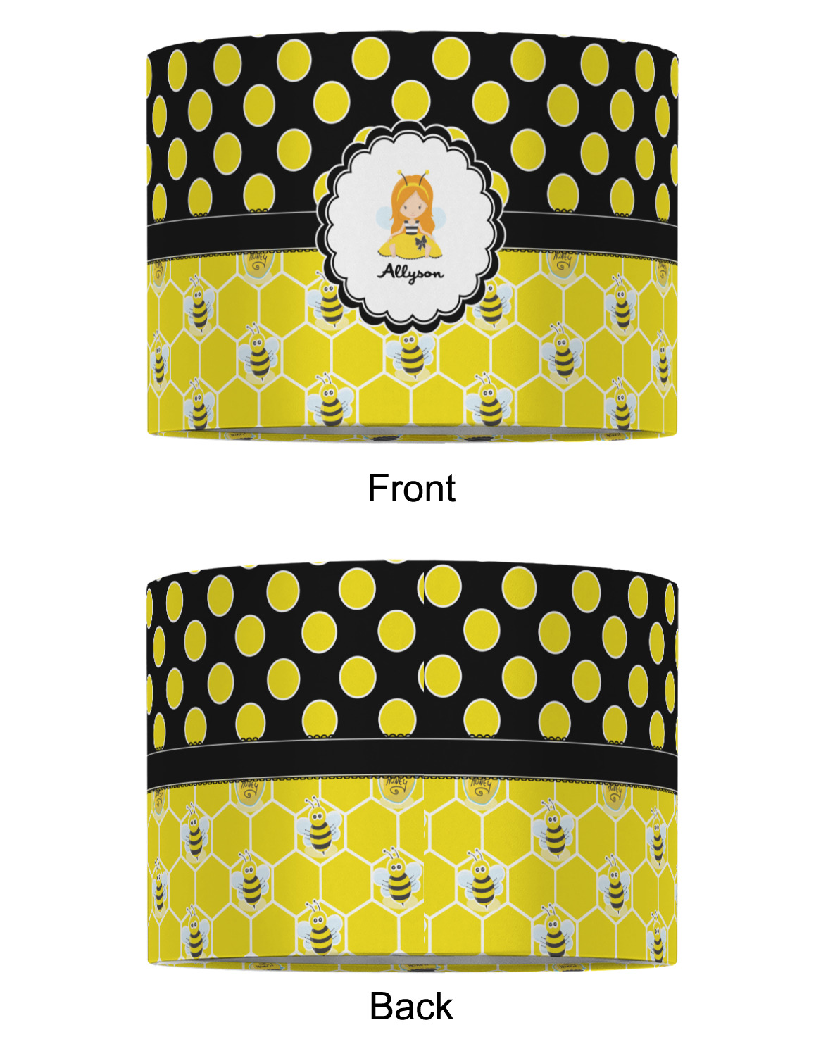 A wide lace black ribbon separates the pattern and connects a beautiful black trimmed white decorative label that provides a focal point for either a little bumble-bee or a bumble-bee obsessed girl and his/her name. As a special touch, personalize your little bumble-bee girl's hair and skin color.