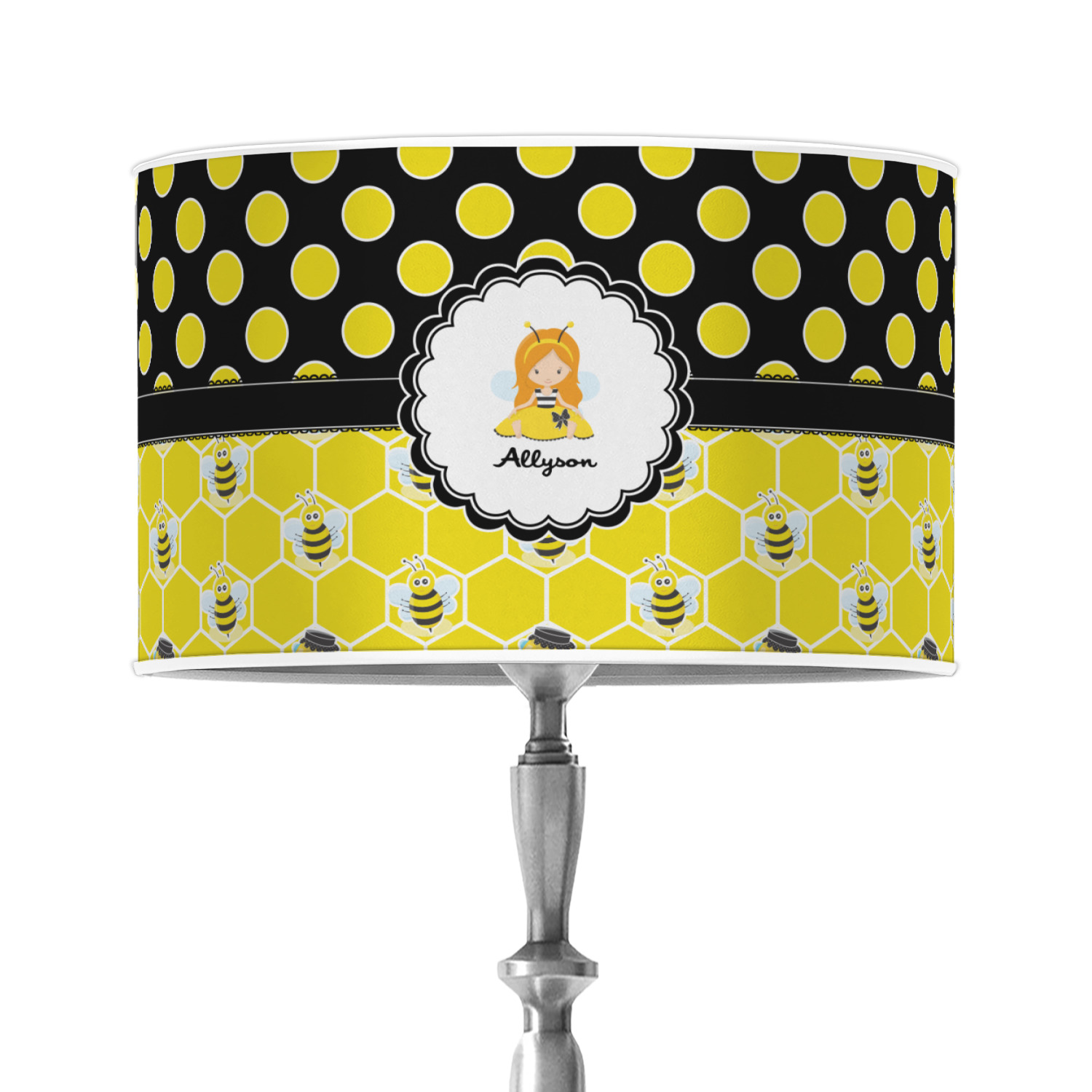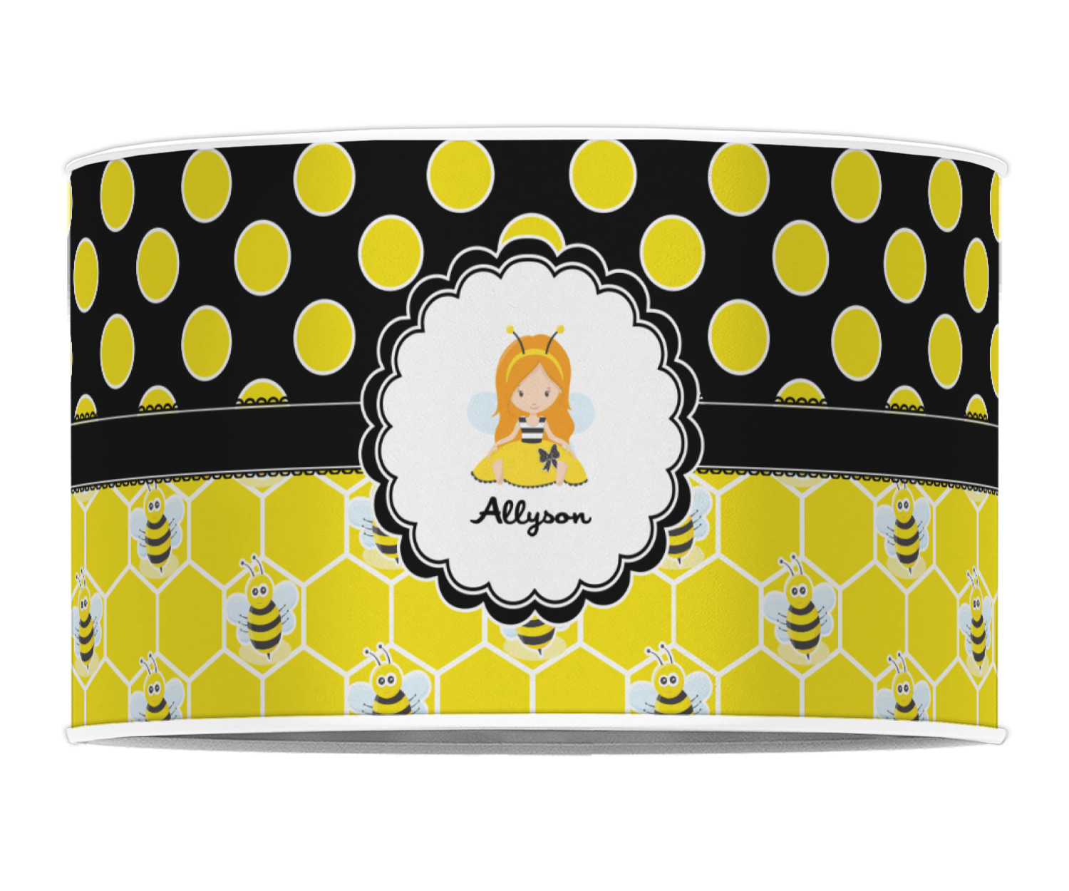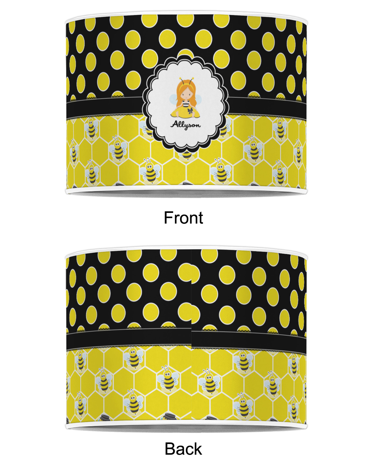 A wide lace black ribbon separates the pattern and connects a beautiful black trimmed white decorative label that provides a focal point for either a little bumble-bee or a bumble-bee obsessed girl and his/her name. As a special touch, personalize your little bumble-bee girl's hair and skin color.