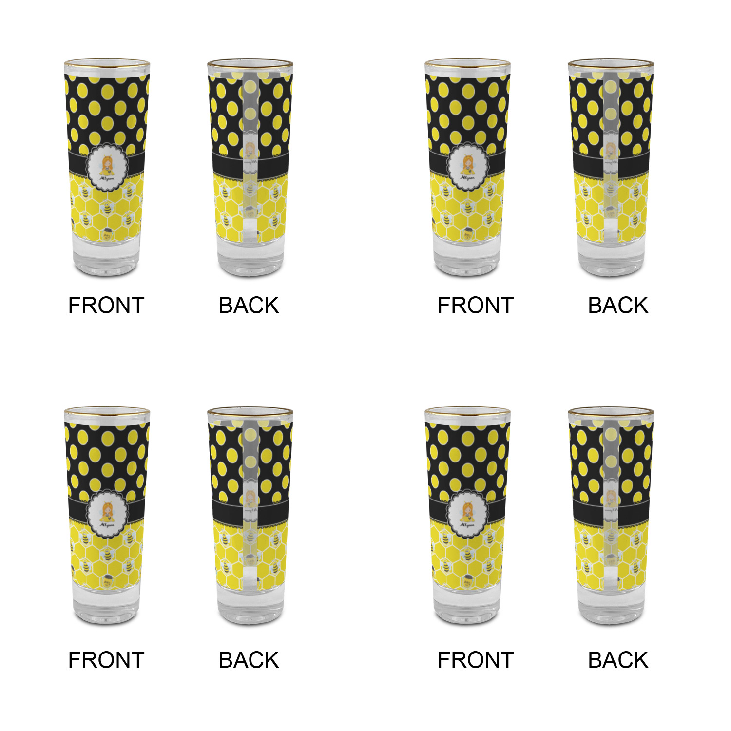 These glass shooter glasses are printed in full color with the design of your choice. These are a tall shooter 2 oz size and stand 4" tall. The print is a full wrap design to boldly display your personalization.