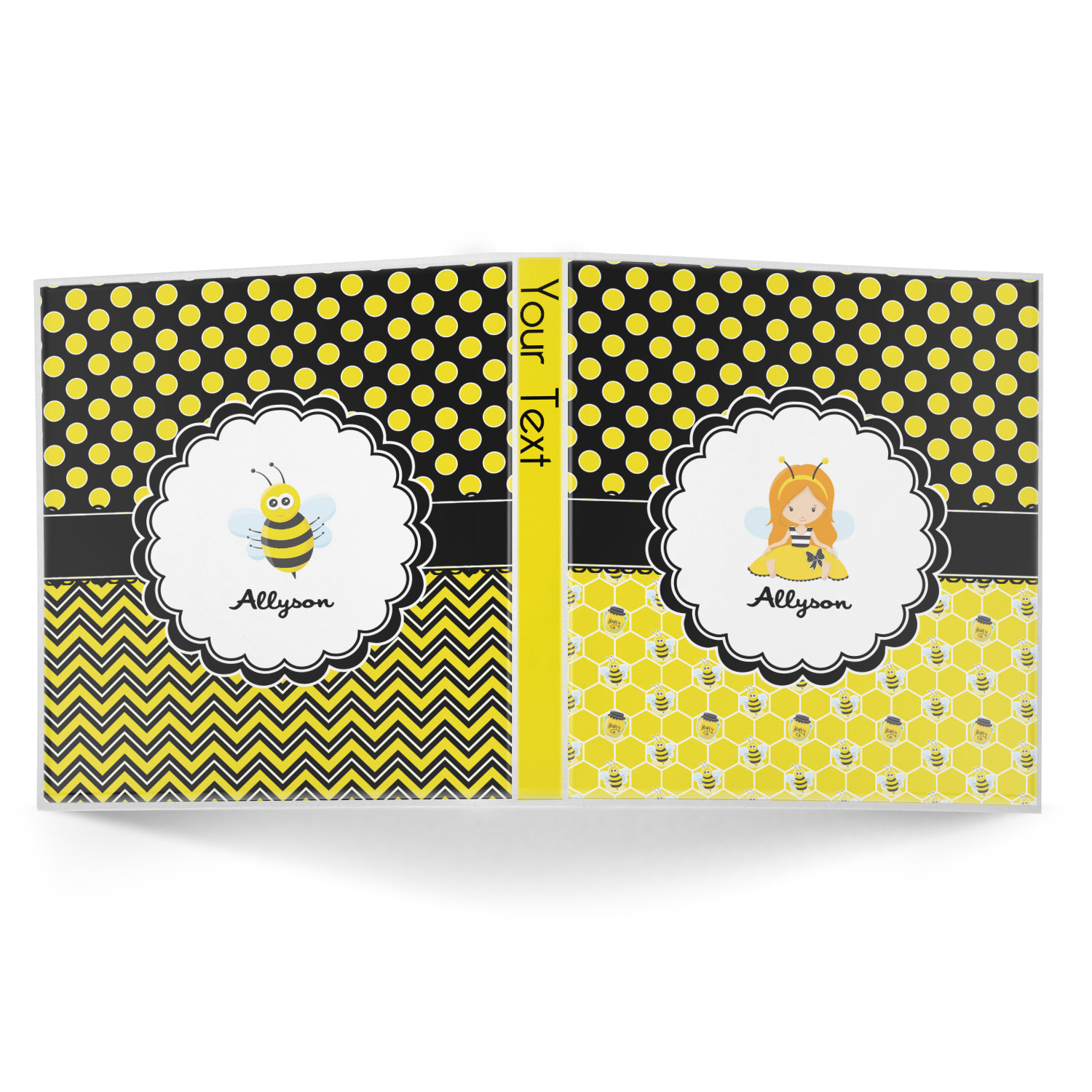 A wide lace black ribbon separates the pattern and connects a beautiful black trimmed white decorative label that provides a focal point for either a little bumble-bee or a bumble-bee obsessed girl and his/her name. As a special touch, personalize your little bumble-bee girl's hair and skin color.