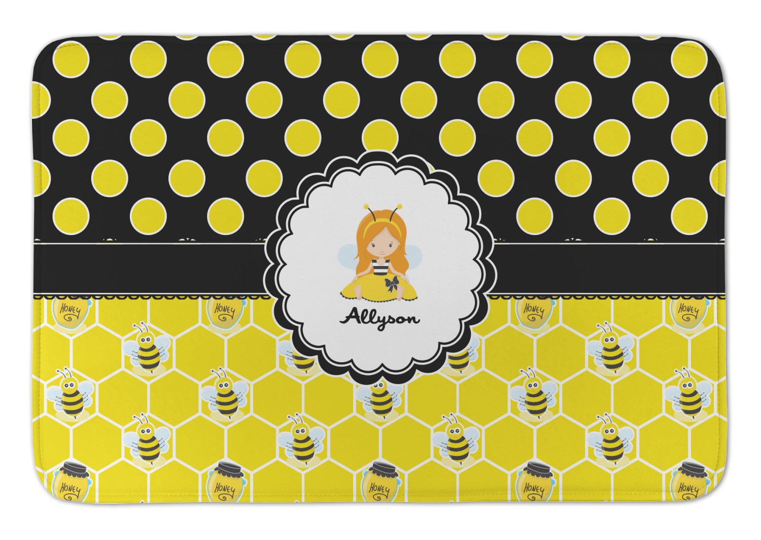 A wide lace black ribbon separates the pattern and connects a beautiful black trimmed white decorative label that provides a focal point for either a little bumble-bee or a bumble-bee obsessed girl and his/her name. As a special touch, personalize your little bumble-bee girl's hair and skin color.