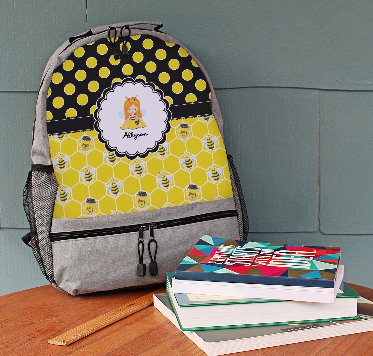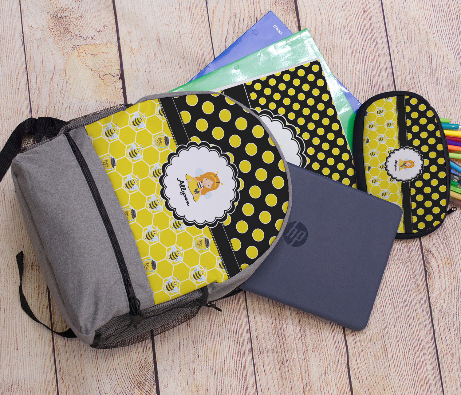 A wide lace black ribbon separates the pattern and connects a beautiful black trimmed white decorative label that provides a focal point for either a little bumble-bee or a bumble-bee obsessed girl and his/her name. As a special touch, personalize your little bumble-bee girl's hair and skin color.