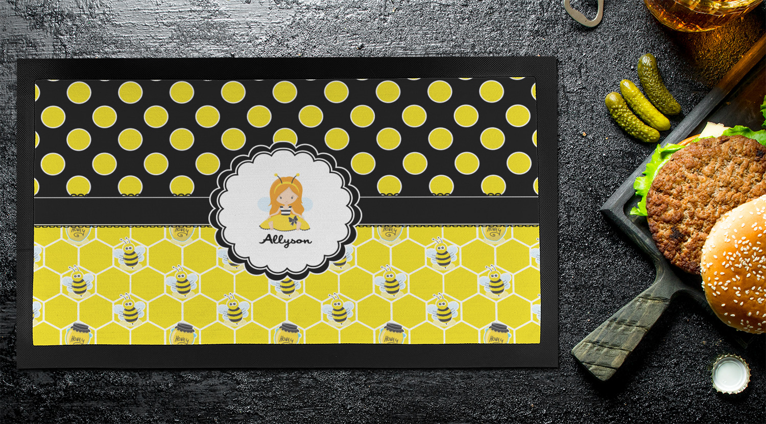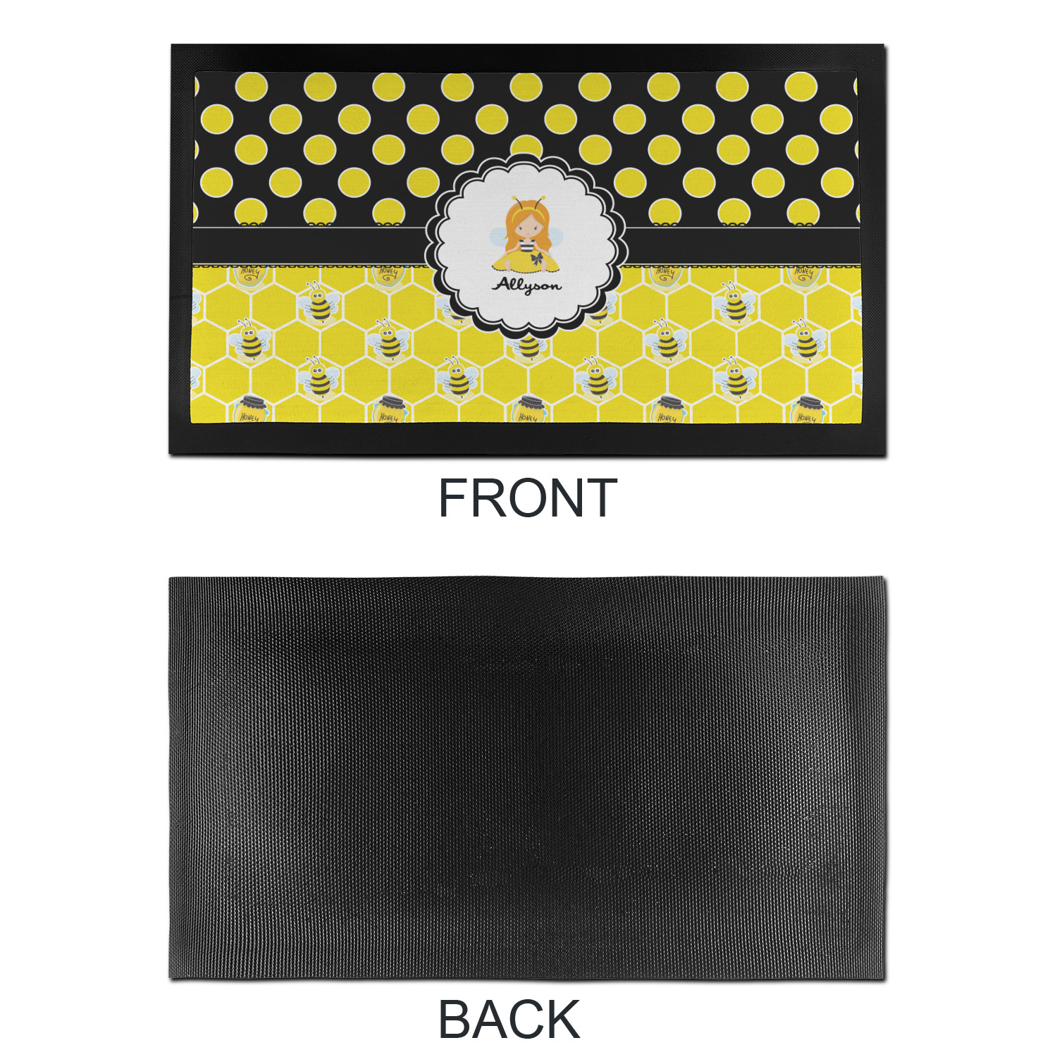A wide lace black ribbon separates the pattern and connects a beautiful black trimmed white decorative label that provides a focal point for either a little bumble-bee or a bumble-bee obsessed girl and his/her name. As a special touch, personalize your little bumble-bee girl's hair and skin color.