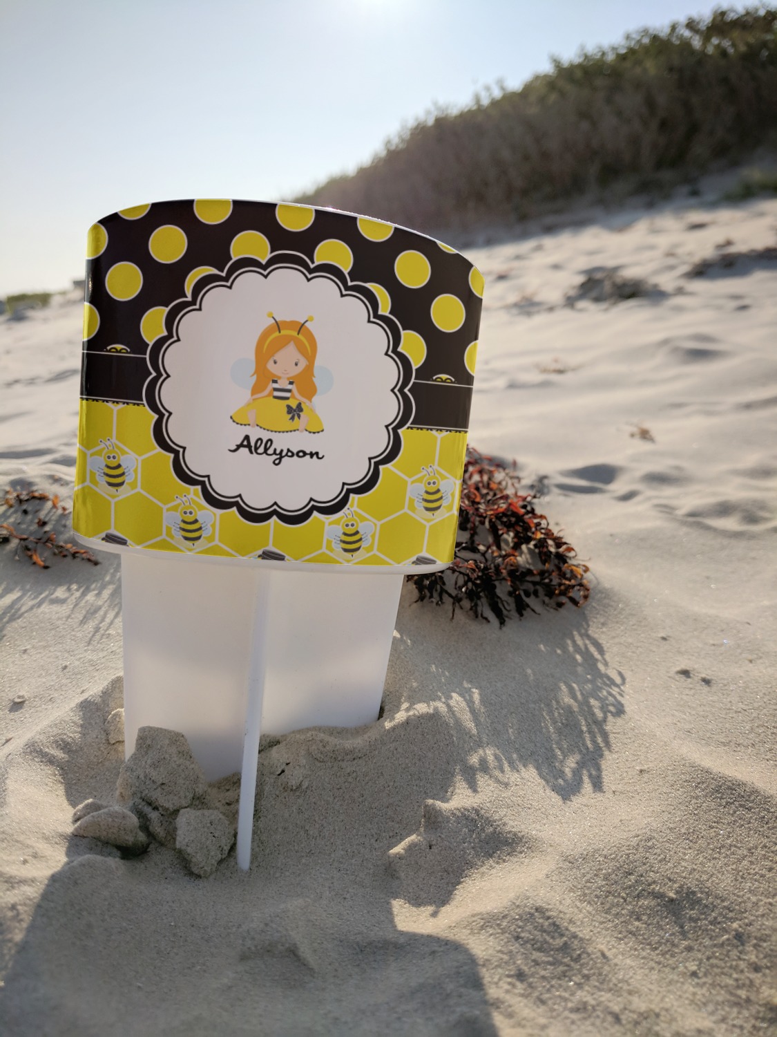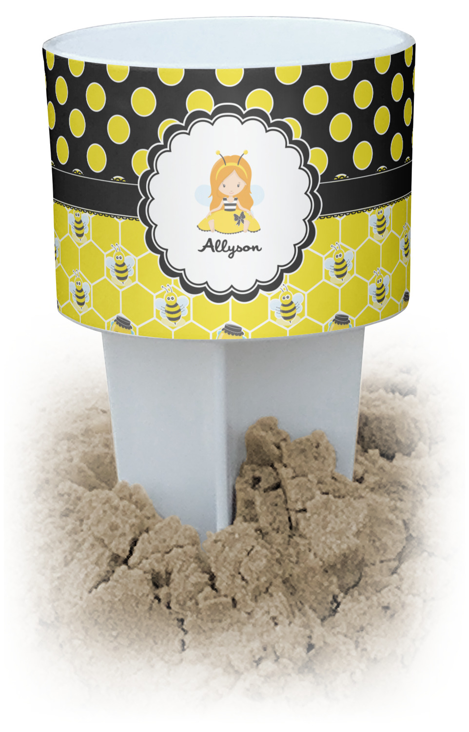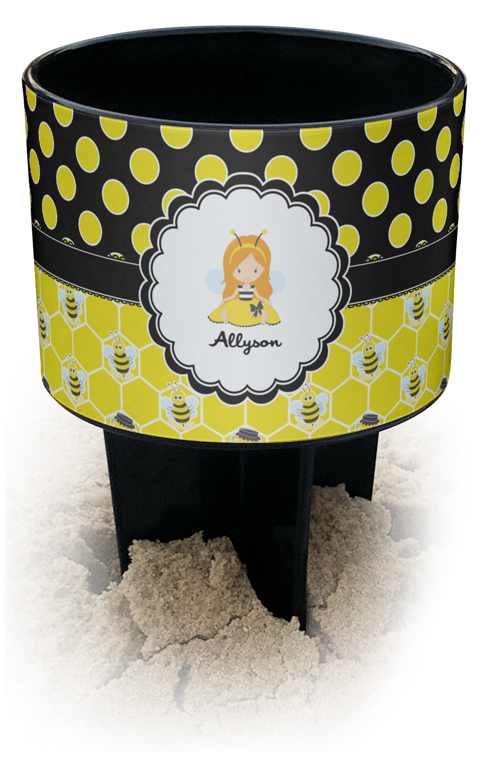 This cup holder has a large stake at its bottom that anchors it to the sand or ground below, while the cup holder rests above the stake. The entire drink holder is made of durable plastic and displays your customization around the cup holder portion. We sell these personalized beach spikers in two different colors: black and white.