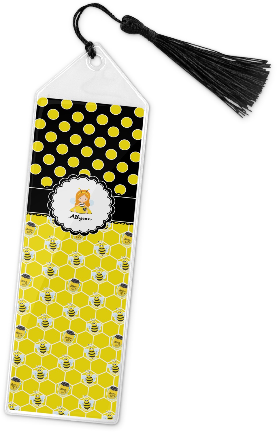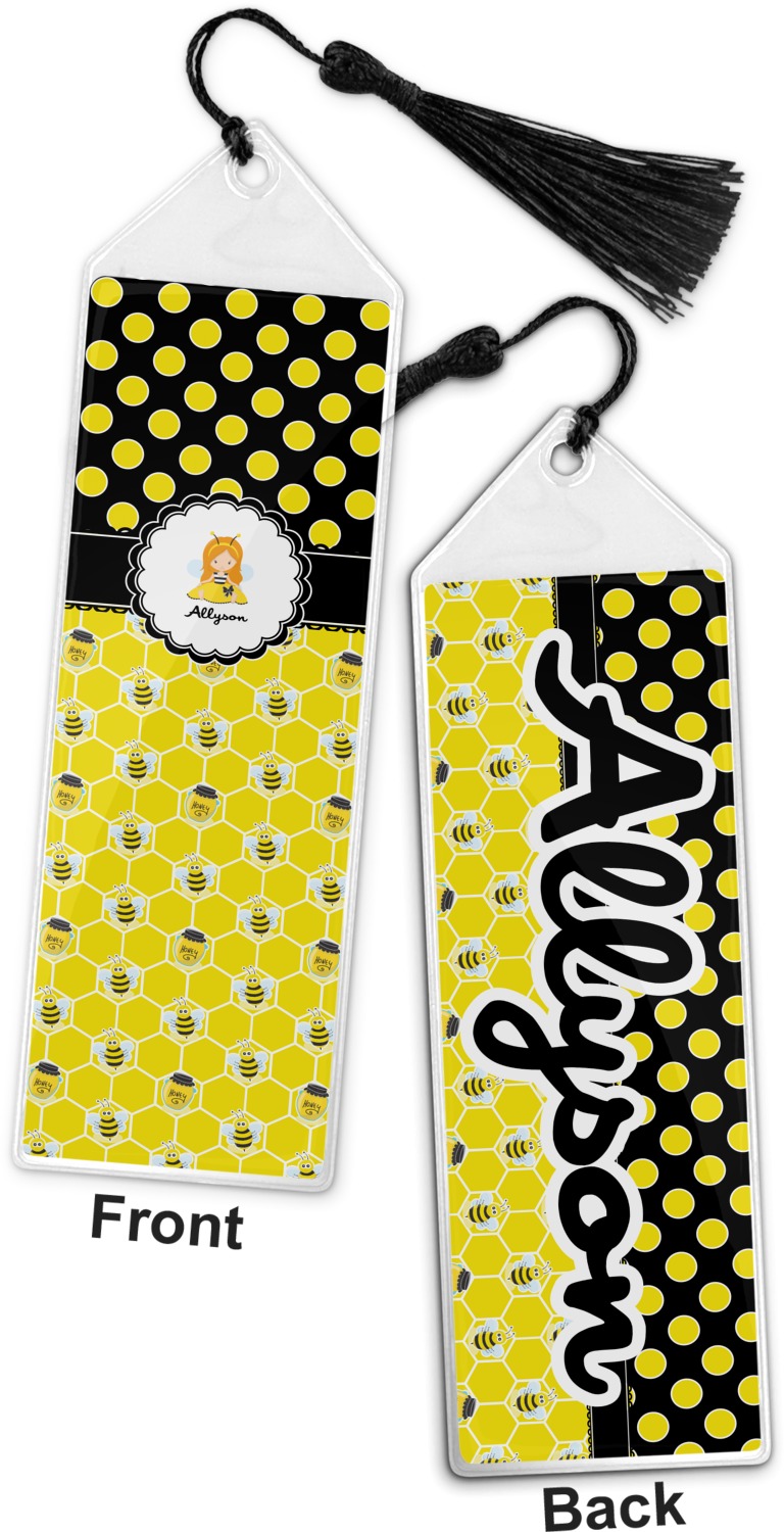 Your personalized bookmark is made of a sturdy, clear vinyl, and is approximately 7.5" x 2.25". We display your personalization on vinyl inserts that are placed on both sides. Accompanying each book marker is a black, fringe tassel that attaches to the reinforced, triangular header.