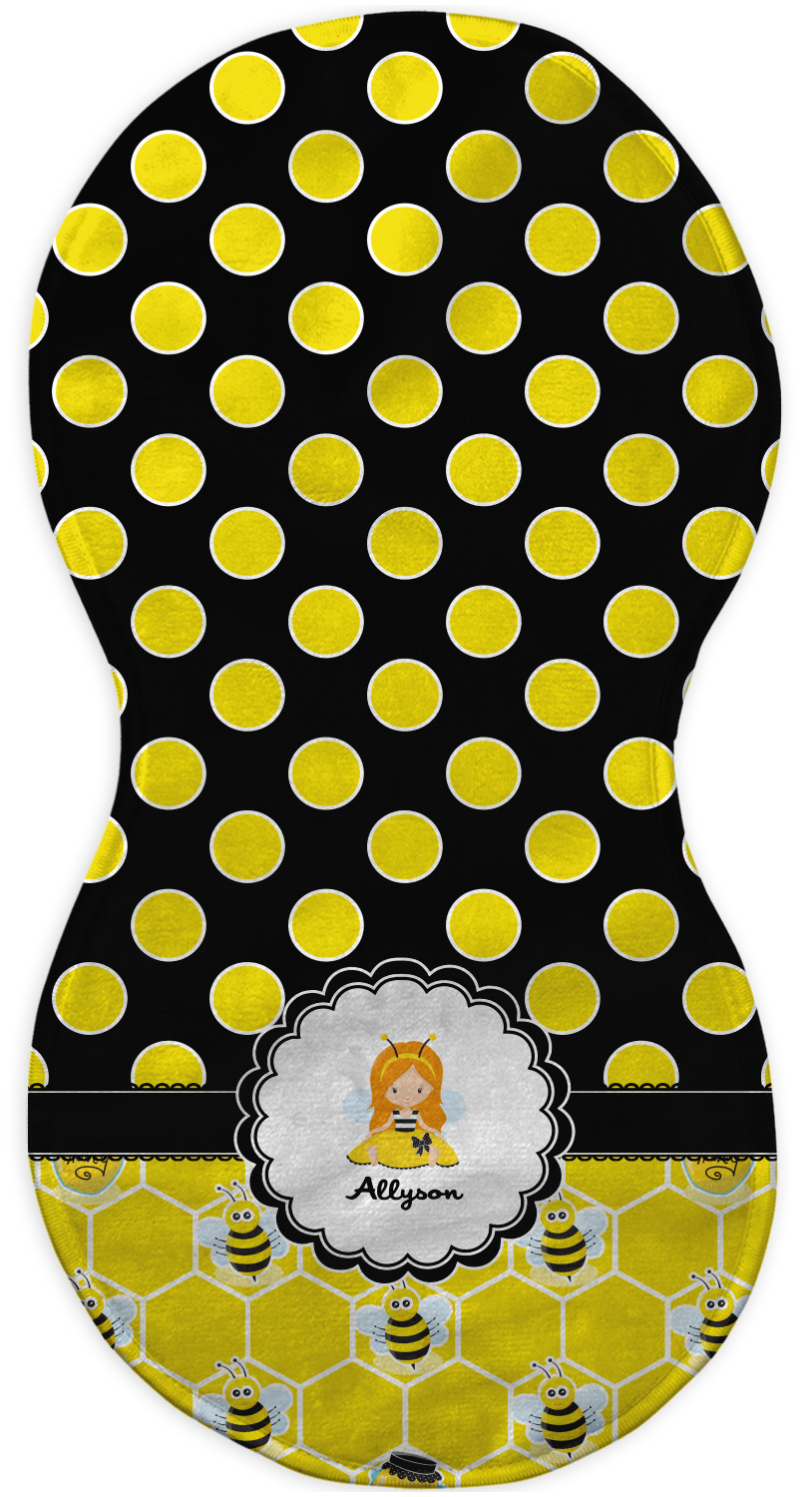 A wide lace black ribbon separates the pattern and connects a beautiful black trimmed white decorative label that provides a focal point for either a little bumble-bee or a bumble-bee obsessed girl and his/her name. As a special touch, personalize your little bumble-bee girl's hair and skin color.