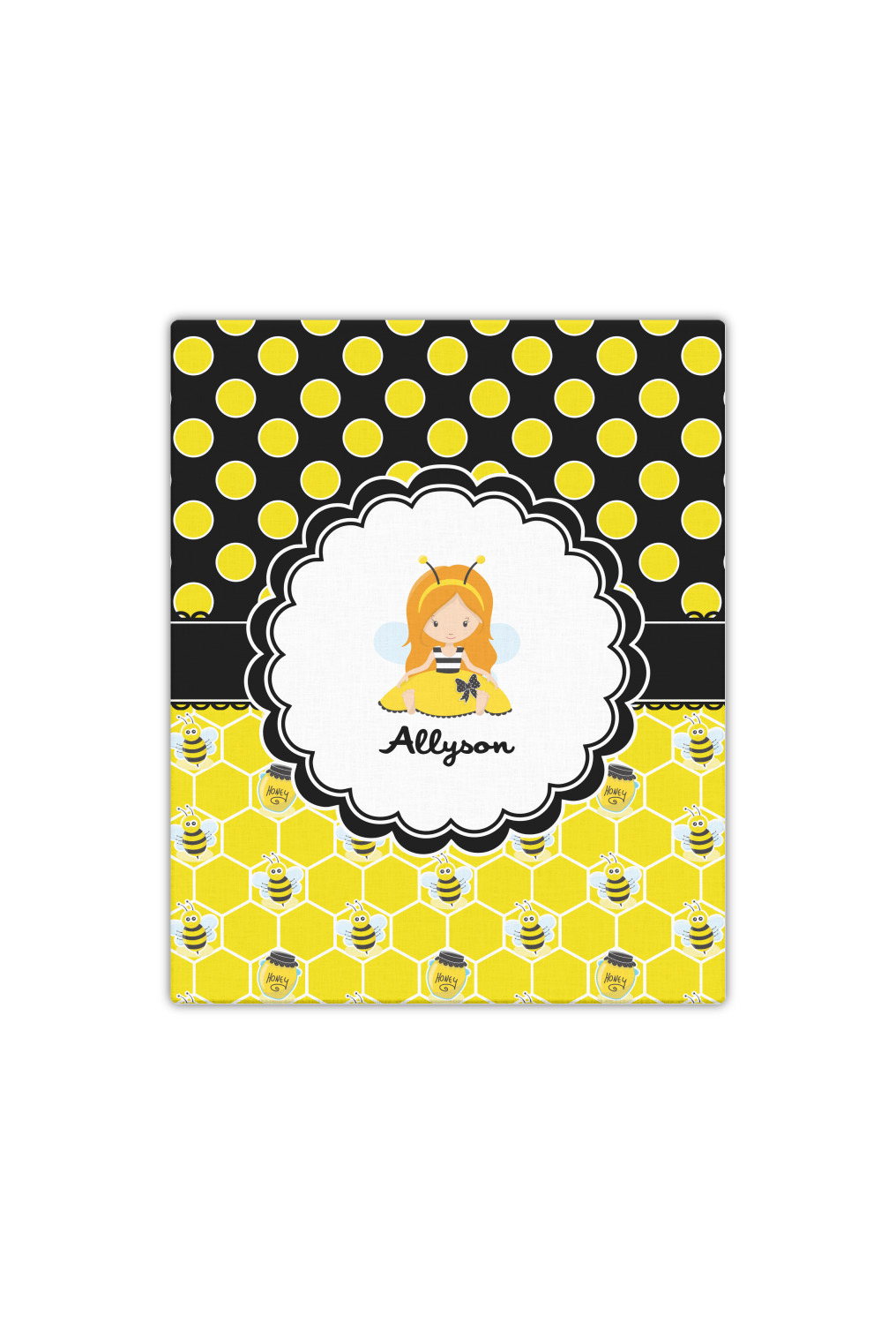 A wide lace black ribbon separates the pattern and connects a beautiful black trimmed white decorative label that provides a focal point for either a little bumble-bee or a bumble-bee obsessed girl and his/her name. As a special touch, personalize your little bumble-bee girl's hair and skin color.