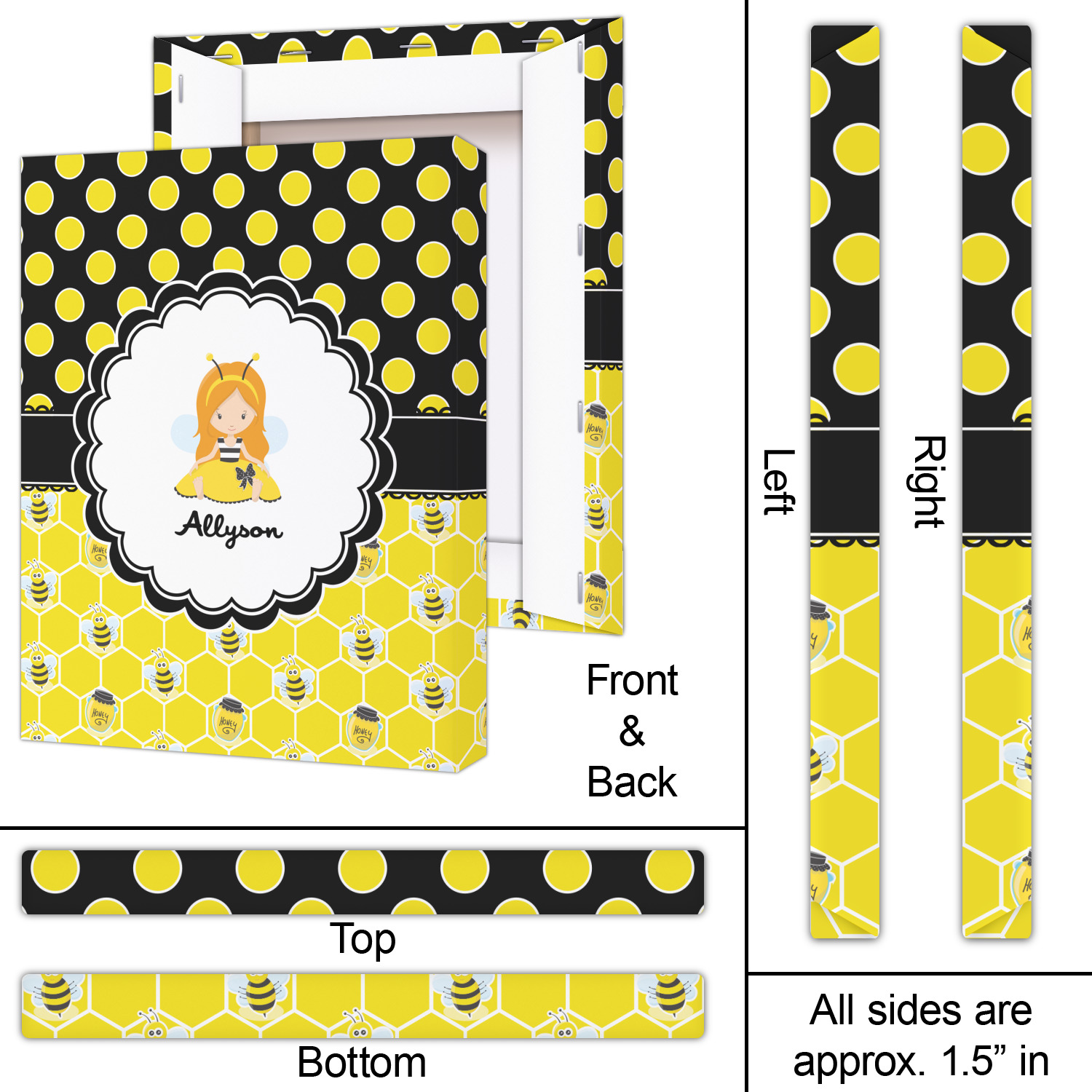 Our little bees have been hard at work and Winnie the Pooh would be jealous of this stash of honey. We used a playful polka dot pattern of black and yellow. On the bottom our bees have been hard at work making honey out of the honeycombs.