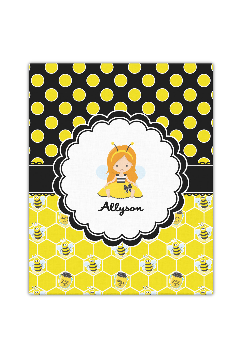 A wide lace black ribbon separates the pattern and connects a beautiful black trimmed white decorative label that provides a focal point for either a little bumble-bee or a bumble-bee obsessed girl and his/her name. As a special touch, personalize your little bumble-bee girl's hair and skin color.