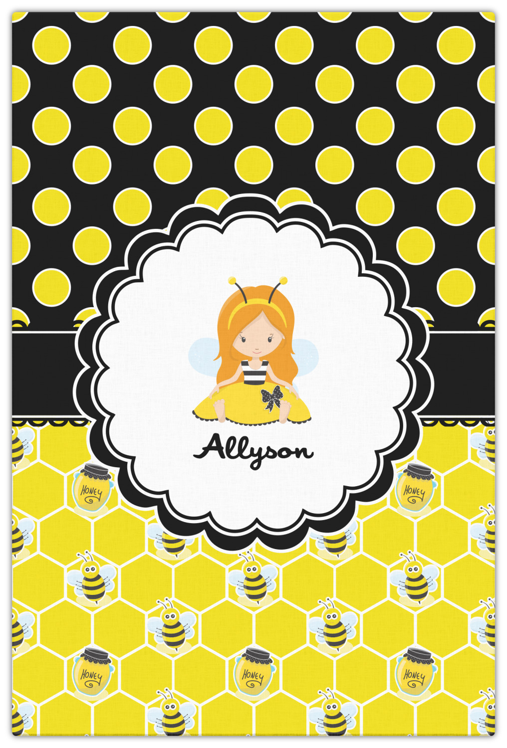 A wide lace black ribbon separates the pattern and connects a beautiful black trimmed white decorative label that provides a focal point for either a little bumble-bee or a bumble-bee obsessed girl and his/her name. As a special touch, personalize your little bumble-bee girl's hair and skin color.